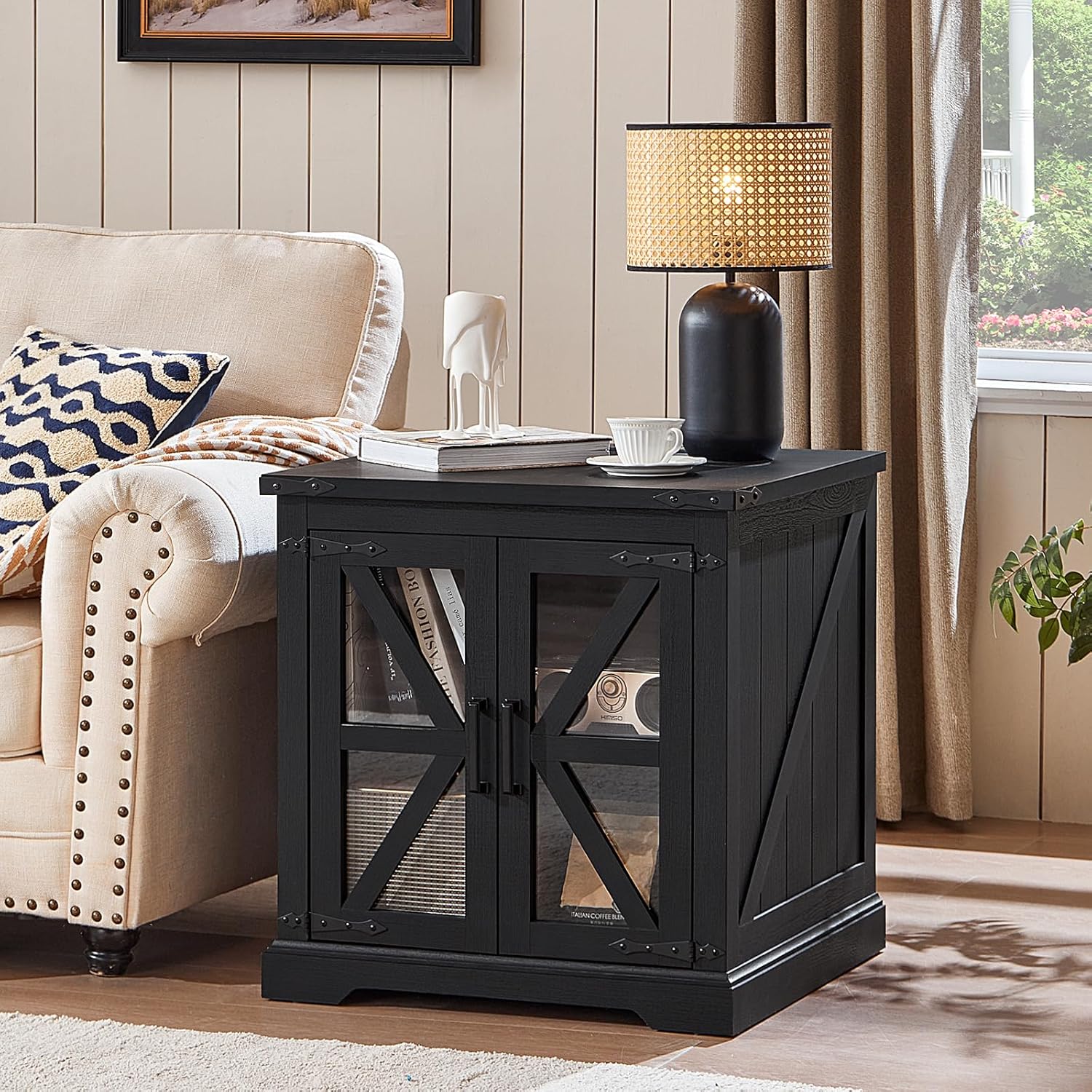 - π‘[Functional Art Piece]The oversized end tables living room storage design provides convenient storage for your living space. The built-in shelves can be adjusted to 3 different heights as per your needs, accommodating an abundance of books, blankets, or coffee mugs. The glass barn-style doors blend traditional farmhouse aesthetics with a modern sensibility, transforming this piece into a more contemporary farmhouse night stand, coffee table, bedside table, or side-of-sofa art.