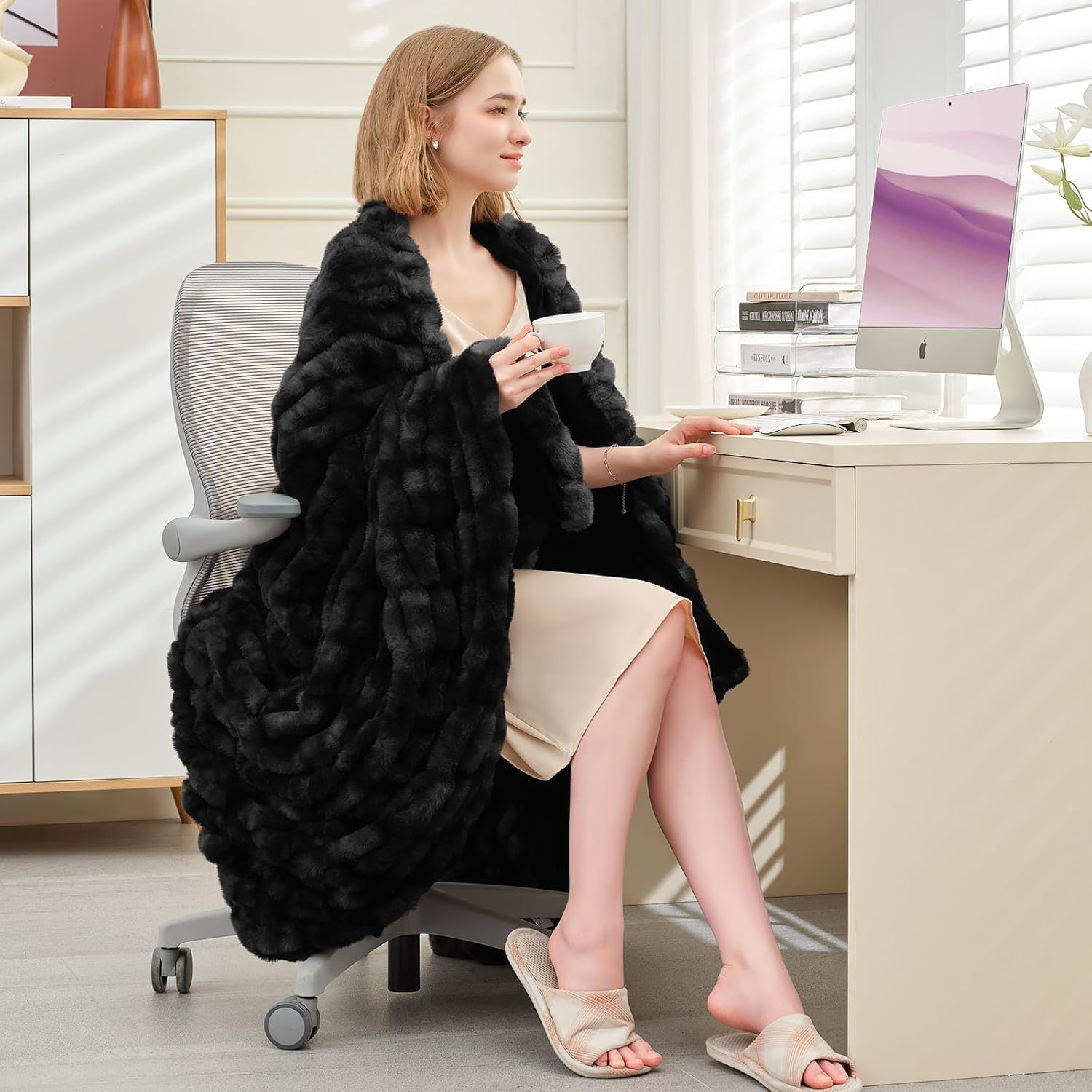 - Luxurious Cozy Wrinkled Faux Fur Blanket: Wrap yourself in ultimate comfort with our fluffy rabbit fur blanket. Made from a luxurious blend of faux fur and minky, this 655GSM blanket features a crystal velvet lining for a double-sided experience. Enjoy the supreme coziness of rabbit fur without compromising on animal life. Perfect for adding a touch of luxury to your home.