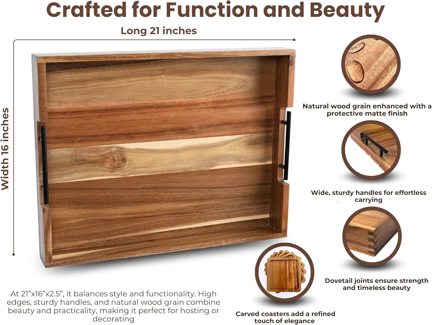 Acacia Wooden Ottoman Tray for Living Room – 21" Large Coffee Table Serving Tray with Handles & 6 Coasters Set, Perfect for Food, Drinks, Kitchen, and Home Decor