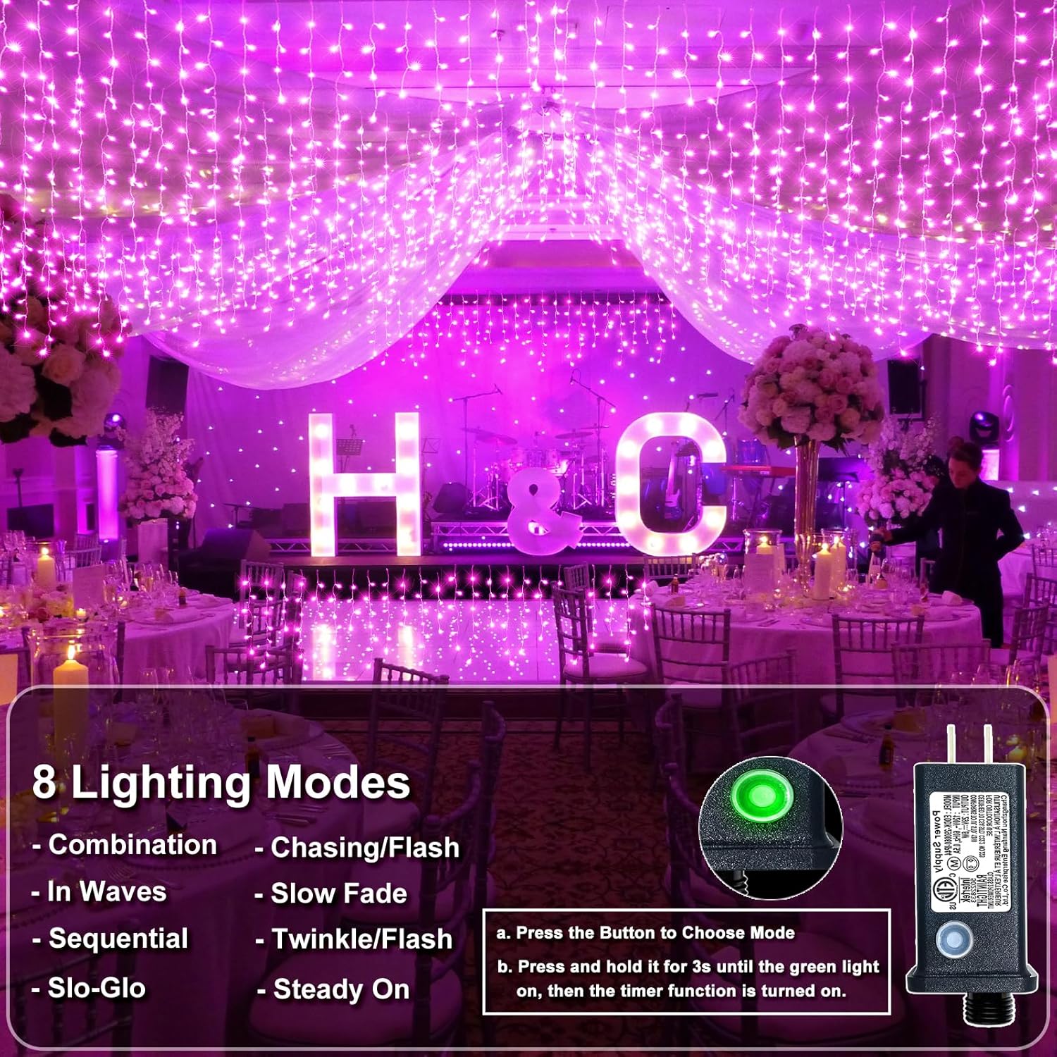 - 【Convenient Timer Function】Activate the timer by pressing the adapter button for 3 seconds. The lights will automatically turn on for 6 hours and off for 18 hours, saving you the hassle of manual operation. These indoor icicle lights can be easily draped or hung on outdoor roofs, yards, windows, patios, gardens, fences, or in indoor bedrooms, instantly transforming the space into a dreamy, romantic haven.