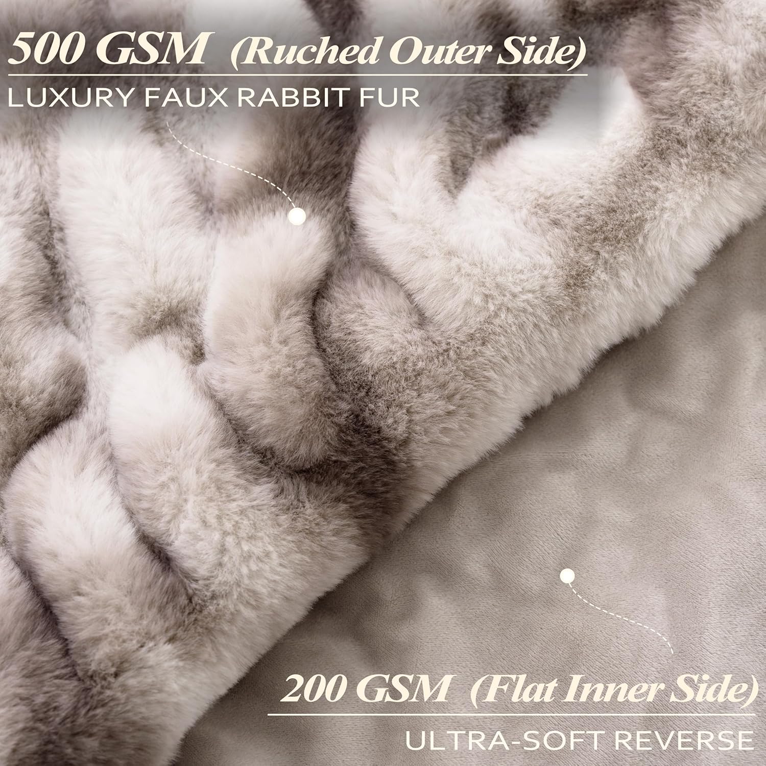 - Luxurious Comfort and Design: Experience exceptional comfort with our faux fur blanket, featuring 500 GSM ruched faux rabbit fur on the outer side and 200 GSM ultra-soft flat inner side. The unique ruched design adds a touch of elegance and visual interest, making it a beautiful addition to room. Its plush texture provides a velvety feel that's irresistibly soft to the touch