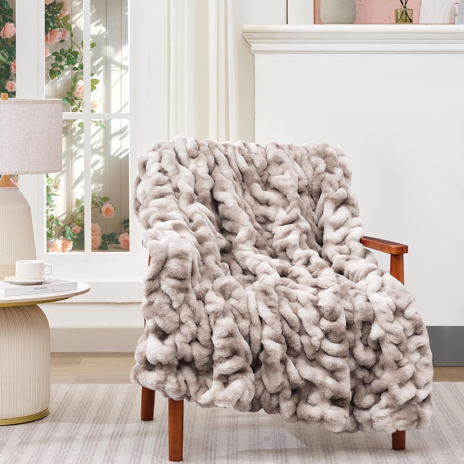 - Luxurious Comfort and Design: Experience exceptional comfort with our faux fur blanket, featuring 500 GSM ruched faux rabbit fur on the outer side and 200 GSM ultra-soft flat inner side. The unique ruched design adds a touch of elegance and visual interest, making it a beautiful addition to room. Its plush texture provides a velvety feel that's irresistibly soft to the touch