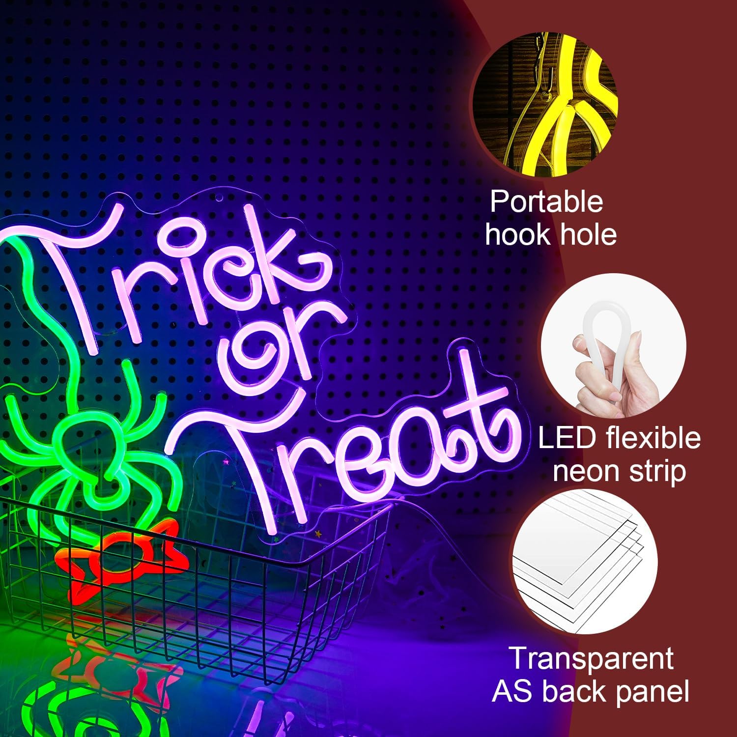 - Trick or Treat Neon Sign: This eerie yet fun neon sign features a hanging spider clutching candy with bold "Trick or Treat" lettering—perfect for adding a thrilling touch to your Halloween decor. Its glowing design instantly transforms any space into a haunted party zone, whether hung indoors or outdoors!