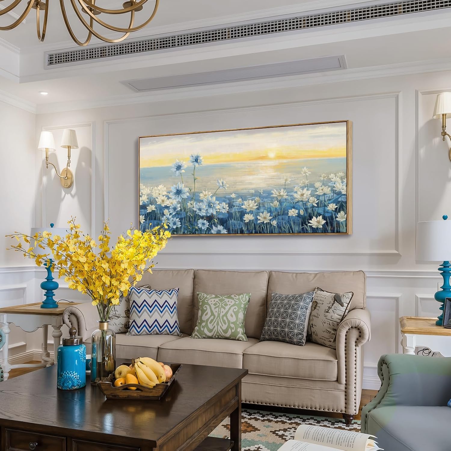 - Bring Tranquility to Your Home: Framed large wall art showcases a vibrant sunset/sunrise flower blooming landscape artwork, withe clear blue water and an orange and yellow sky, gentle flower blossoms, making it a perfect addition to any space in need of a touch of calmness and serenity. The stark contrast of blue and yellow hues, along with the richness of color layers, showcases the splendor of sunset coastal landscape.