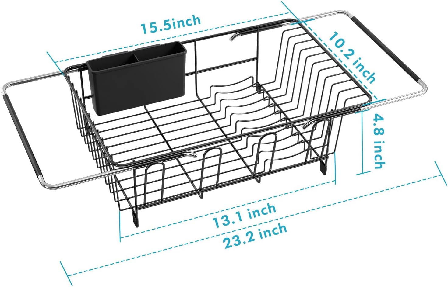 - Adjustable Supporting Bars: The supporting bar of the sink drying rack can be extended from 15.5" to 23.2", This kitchen sink rack is a great space saver that fits over most sinks. If the kitchen counter is small or narrow, the supporting bar of the dish rack can be pulled out to use over the sink, effectively saving you kitchen space and keeping it clean and dry. In addition, the non-slip rubber arms handle covers can effectively prevent the dish rack from slipping