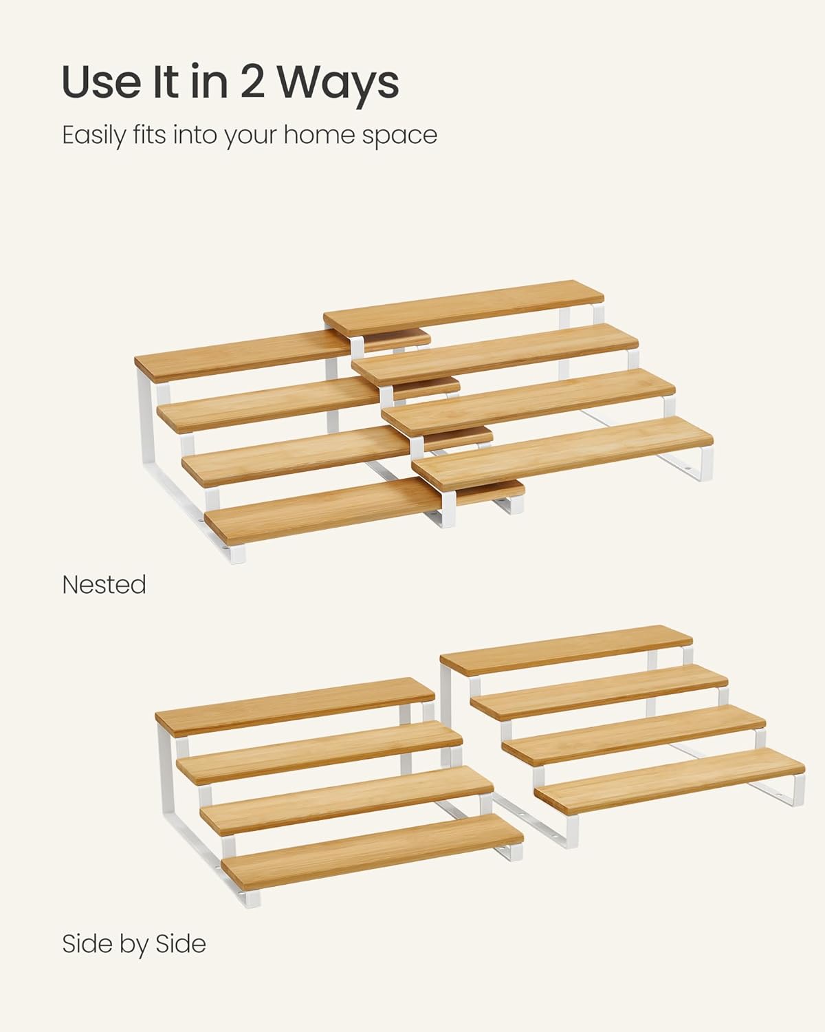 SONGMICS Display Risers, Set of 2 Engineered Wood Perfume Organizer Stand, 4-Tier Cupcake Stand Holder, Spice Rack, Shelf Risers for Figures, Dessert Shelves, Natural Beige and Cloud White UKCS216N02