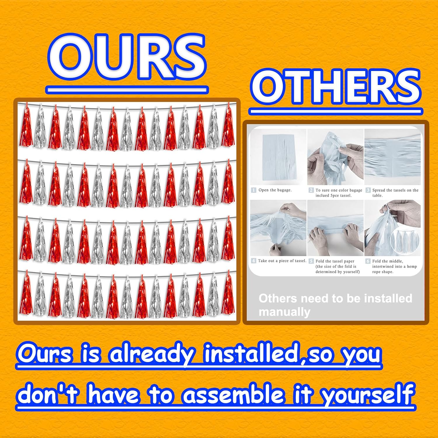 - 【Reusable Tassel Garland Material】: high-quality metallic foil tassel garlands, with the virtue of nice craftsmanship and lightweight, they are reusable and safe, and not easy to fade; They come with white ribbon for hanging, and garland tassels hang perpendicular to the string, and are adjustable to provide you with the option of spreading the tassels out or piecing them closer together.