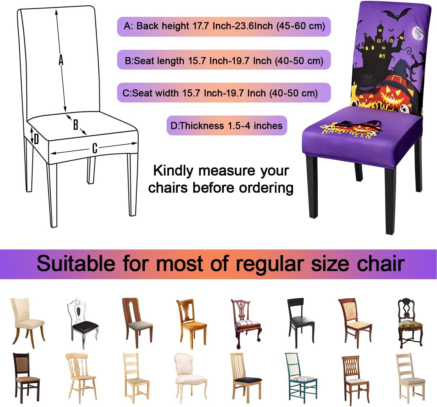 - 【🎃🎃🎃Suitable for Chair Size】- Chair back height 17.7 Inch-25.5 (45-65 cm), chair-back width 13.7-17.0(38-42cm),Inch Chair seat length and width 13.7 Inch-17.7 Inch (38-45 cm).Thickness 1.5-4.5Inch (4-12 cm). Please check the measurement guide in the item picture before order..(Please allow 0.5-1 inch error due to manual measurement.)。Moreover, its easy-care design means it can be washed and reused year after year, making it a smart and sustainable addition to your holiday decor collection.