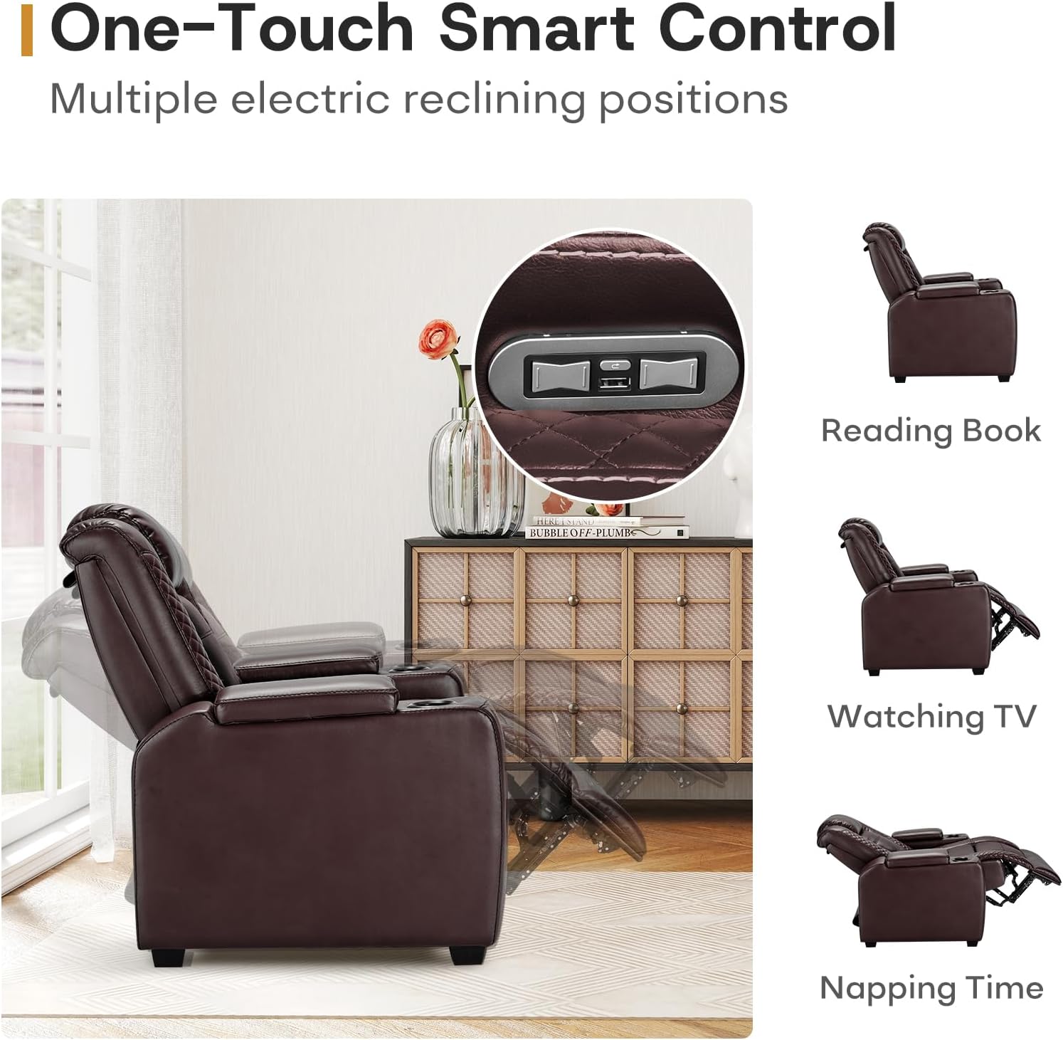 - Arm Storages & USB Port: The power recliner theater seating has a center hidden storage space under the armrest of the electric chair, which can accommodate your magazines, books, etc. The power recliner has a USB port that keep your devices charging. When you sit on the home theater seating, you don't need to worry about losing power to your electronic device, and two cup holders on both sides of the armrests best meets your needs