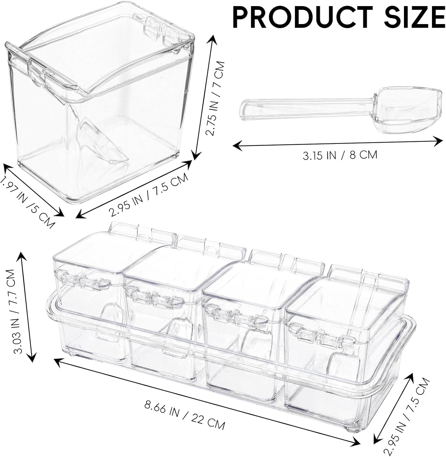 Clear Seasoning Box, 4 Pieces Seasoning Rack Spice Pots, Storage Container Condiment Jars Acrylic Seasoning Box with Covers and Spoons for Spice, Sugar, Salt, Sugar, Cardamon, Cinnamon