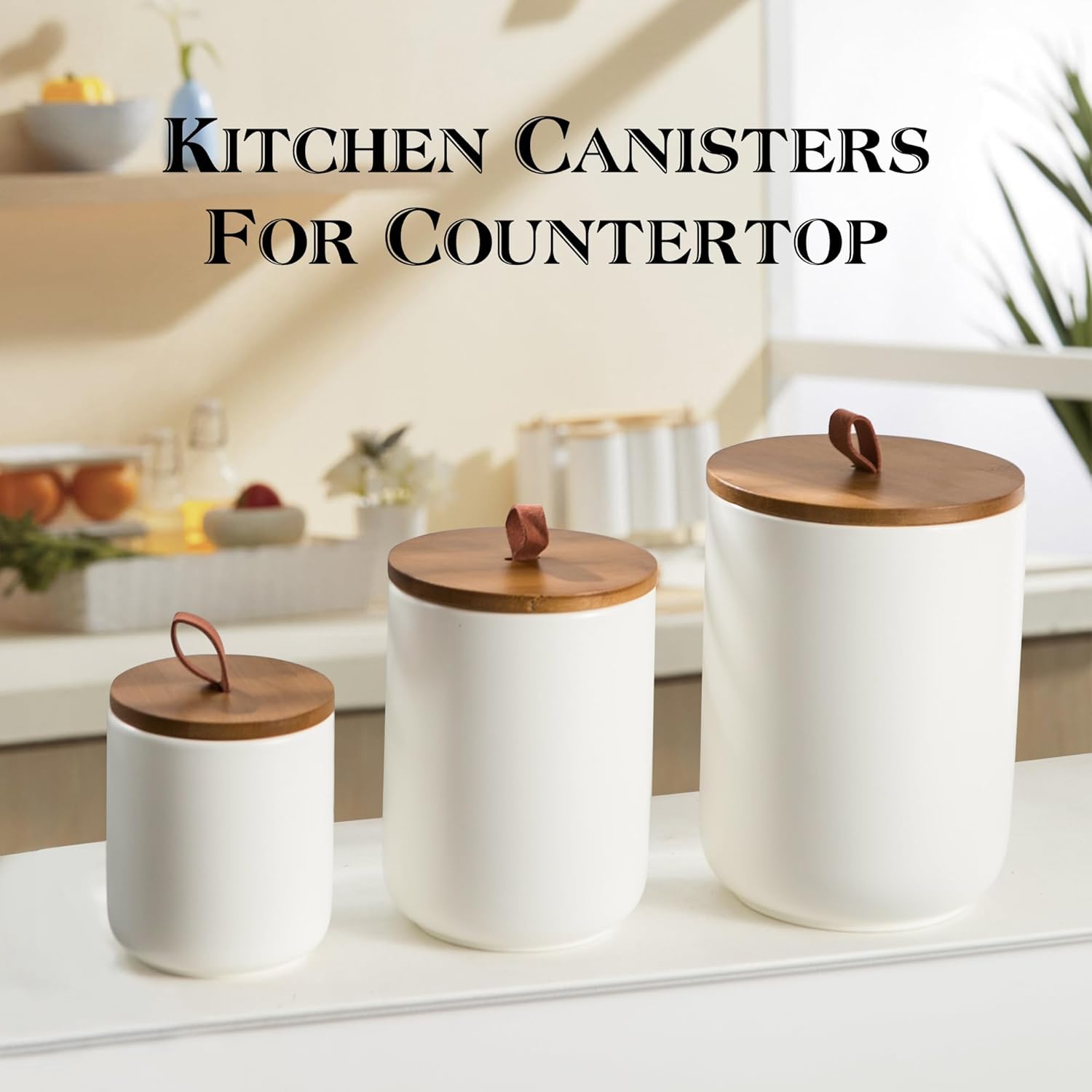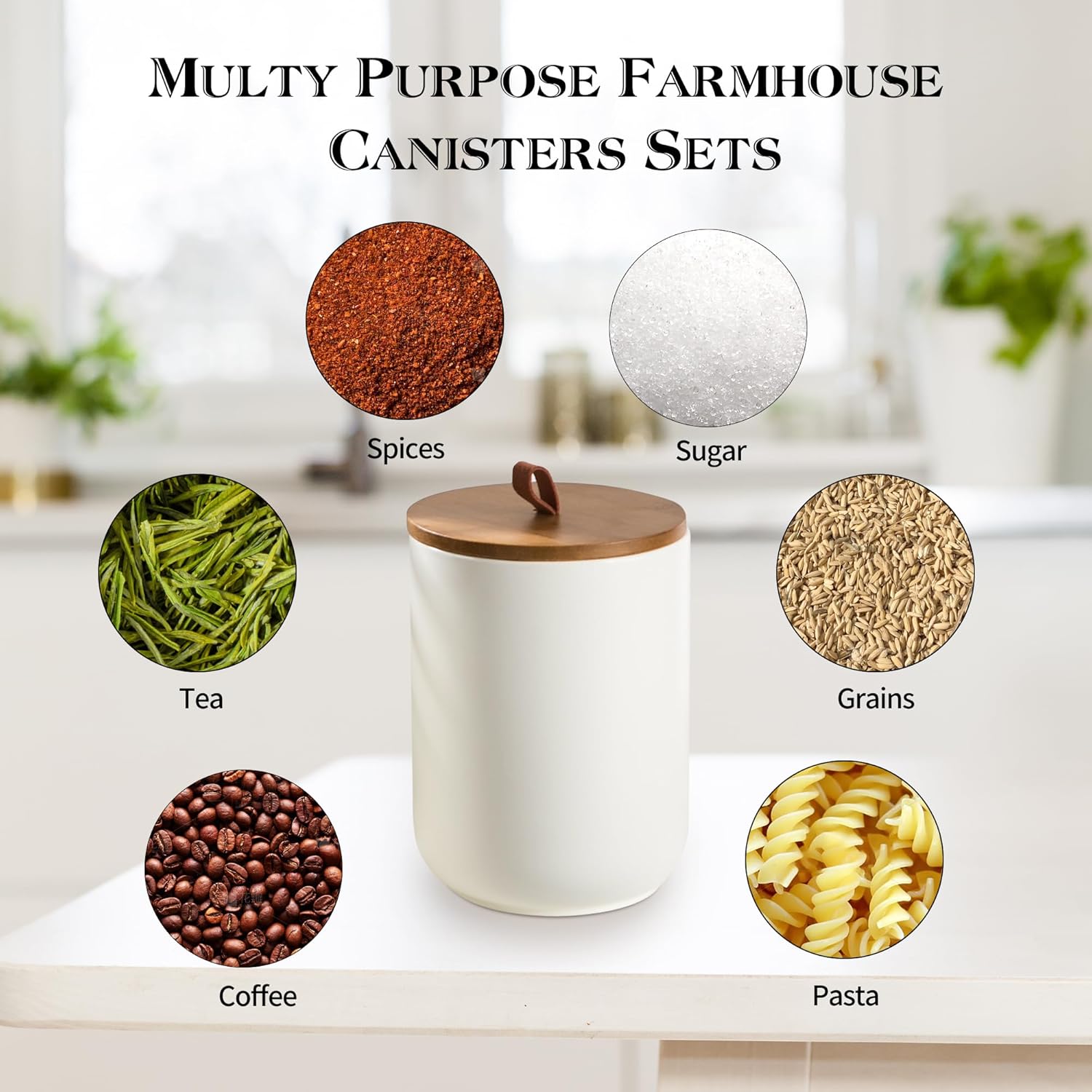 - 【High Quality Materials】These canister sets for kitchen counter are made of sturdy and durable ceramic, durable to withstand daily use, not easy to crack and mold, and the sealed lids are made of wood, equipped with an environmentally friendly sealing rubber ring to create an airtight environment, which can effectively keep items dry and fresh