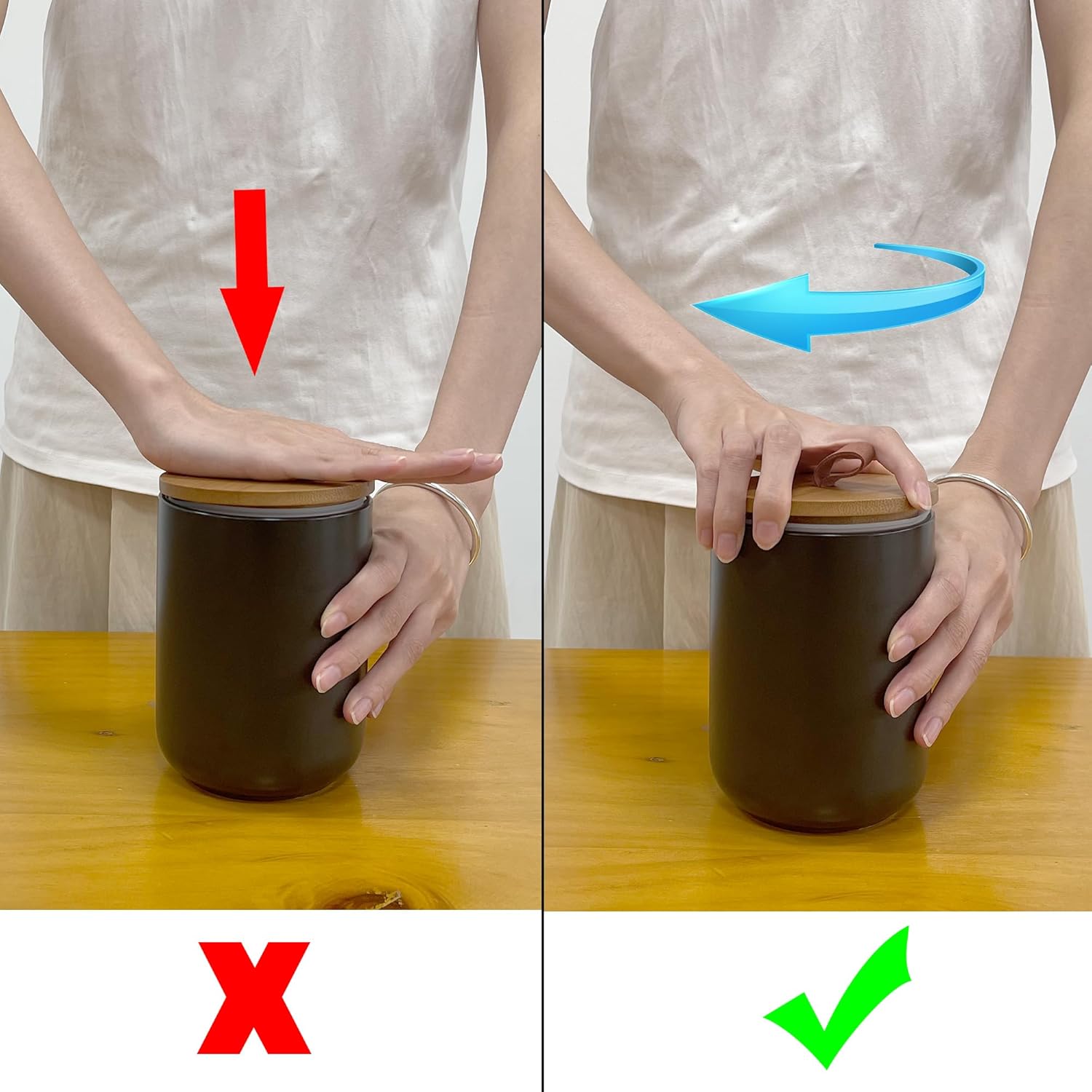 - Easy to Refill & Clean: The wide-mouth design allows for quick scooping, refilling, or cleaning. The ceramic jar is dishwasher safe, while the bamboo lid must be hand washed and dried promptly. Tips; To ensure proper sealing, press the lid downward while twisting it at the same timeโdo not push it straight down without rotation.