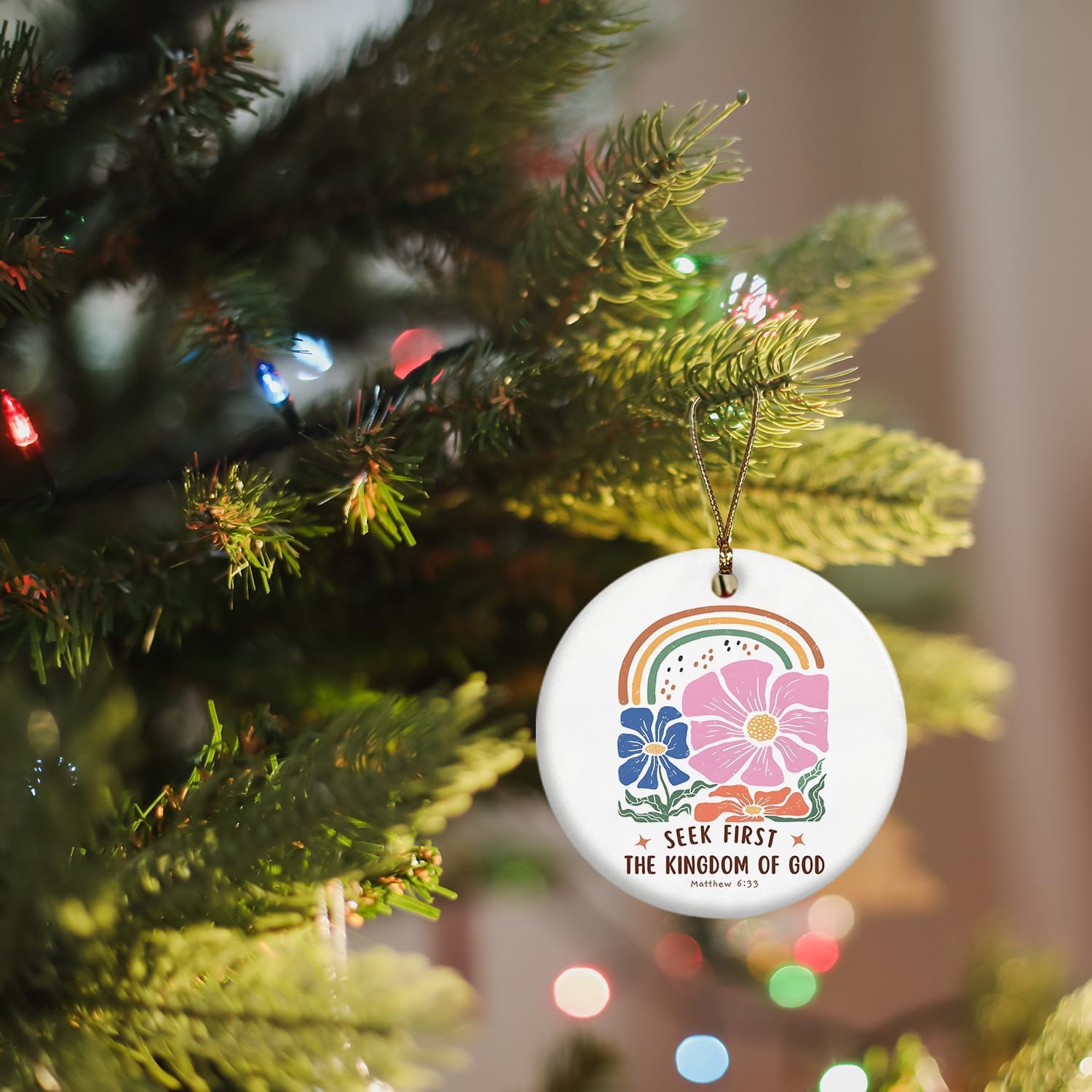 Christian Ornaments, Matthew 6:33 Seek First Scripture 70s Groovy Retro Floral Ceramic Ornament Keepsake Decorations, Christian Gifts for Women Teen Girls