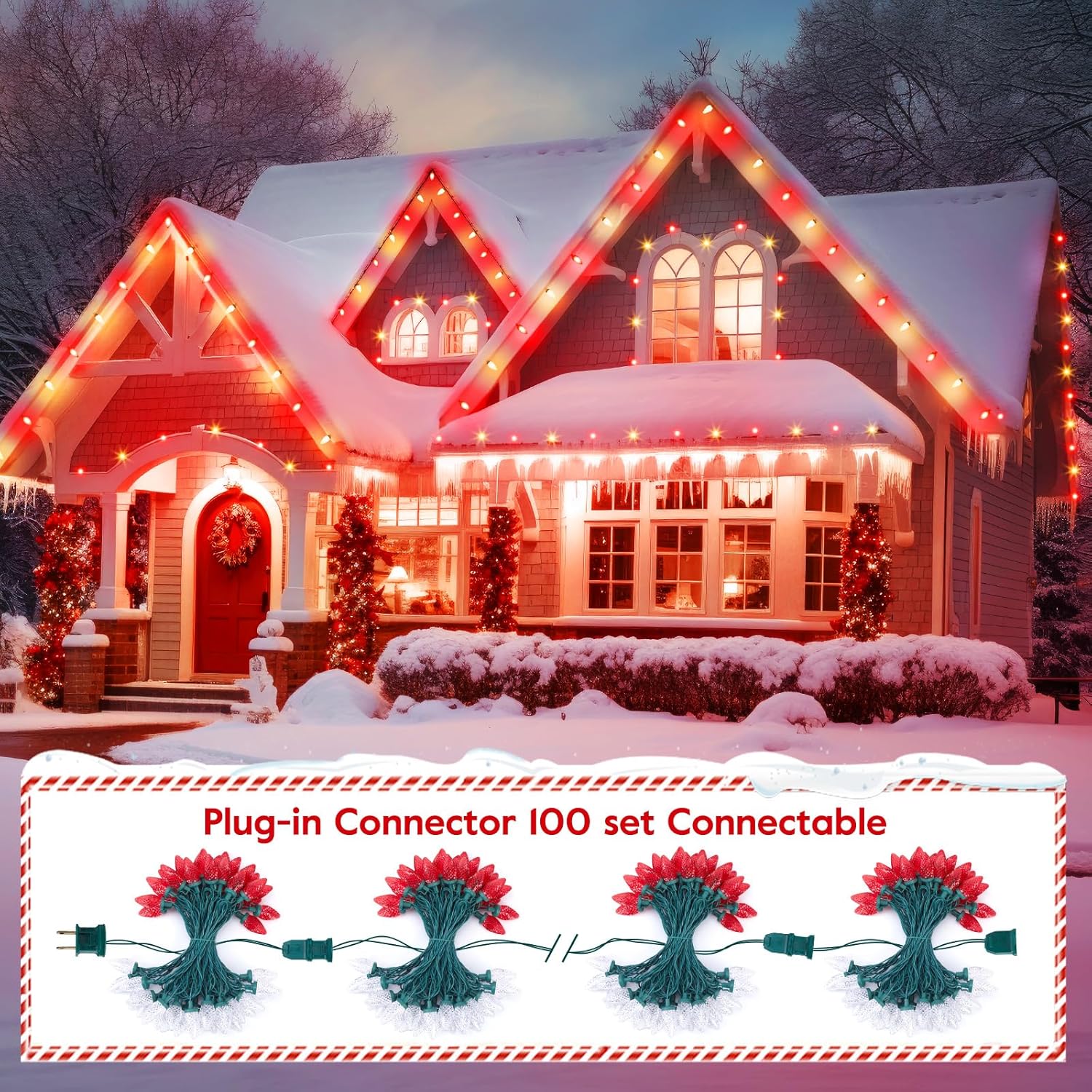 - End-to-End Connectable: Each Christmas light has an end-to-end connector, and you can connect up to 100 sets of these strings end-to-end, freely connecting according to your needs. Hang these fairy lights from your roof, porch, or fence, or wrap them around trees to create a romantic holiday atmosphere and enjoy a happy holiday season with your family.