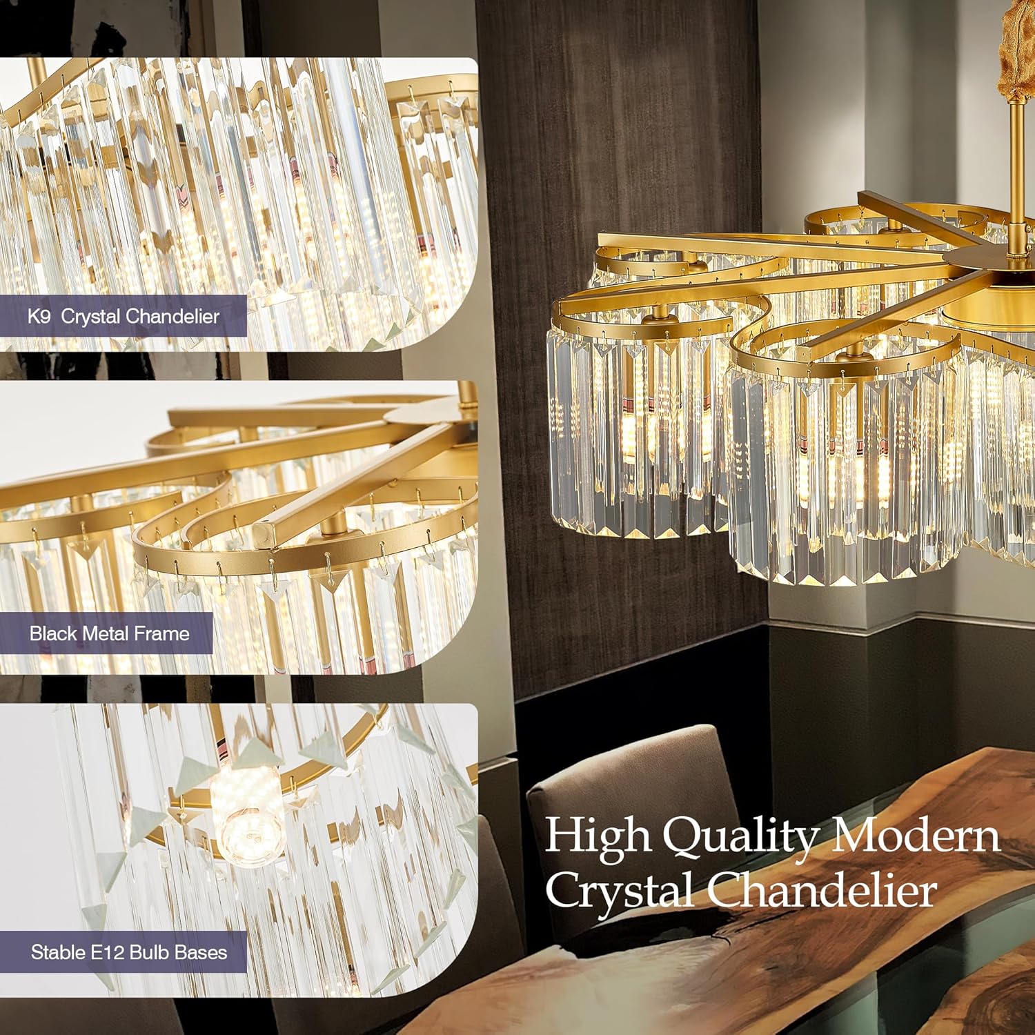 - 【MODERN GOLD CRYSTAL CHANDELIER】This modern gold crystal chandelier is design with 6 ligfht light fixture with golden mental frame to create a very elegant and luxury look at your home. Let the light shining on the unique glass to bring a fascinating glow over your dining table, kitchen island, and living room.