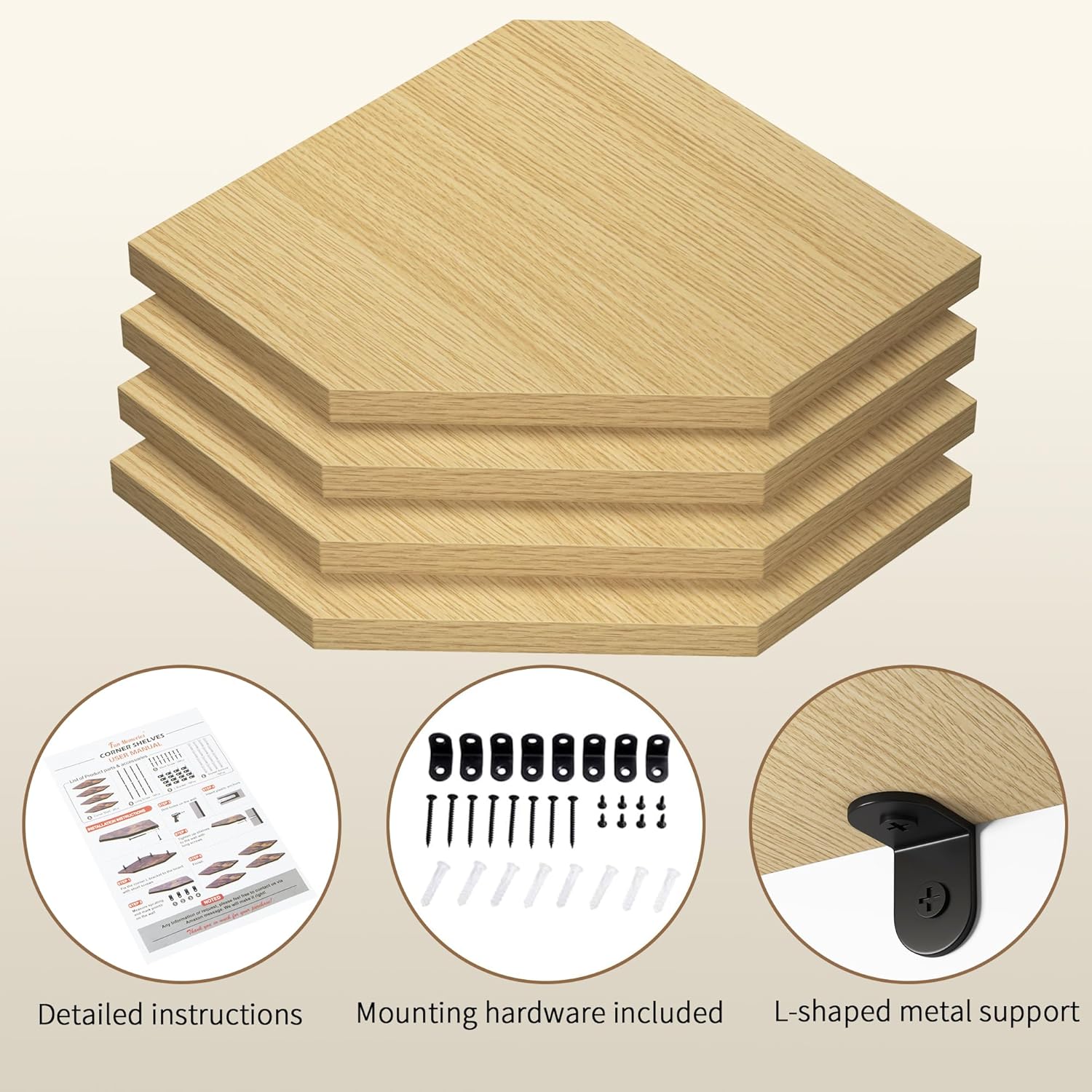 Corner Shelf Wall Mount, Corner Floating Shelves, Set of 4 Corner Wall Shelf Organizer, Rustic Wood Wall Storage Display Shelves for Living Room Bedroom Bathroom Kitchen, Oak