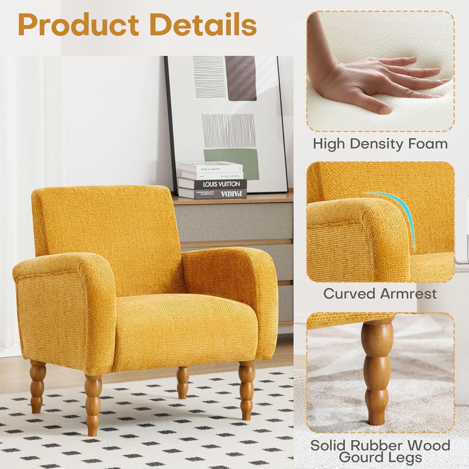 Chenille Fabric Accent Chairs Set of 2, Upholstered Armchair with Solid Wood Legs, Modern Living Room Accent Chair, Comfy Single Sofa Reading Club Chair for Bedroom Reception Lounge, Yellow