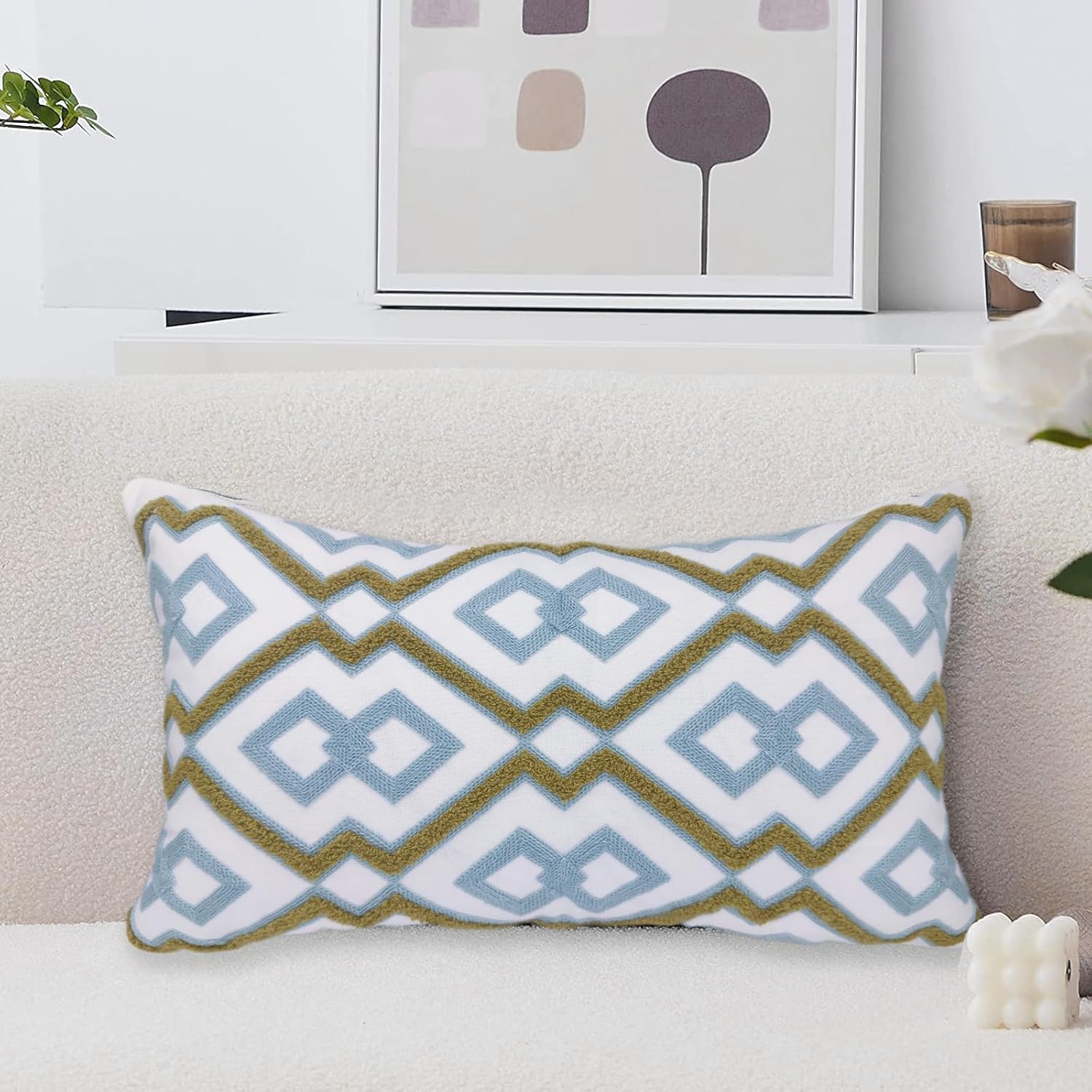 Alysheer Embroidered Lumbar Decorative Throw Pillow Cover 12"x 20", Classic Boho Geometric Embroidery Pattern Cotton Rectangular Cushion Case for Sofa Couch Living Room Bedroom (Blue Khaki)