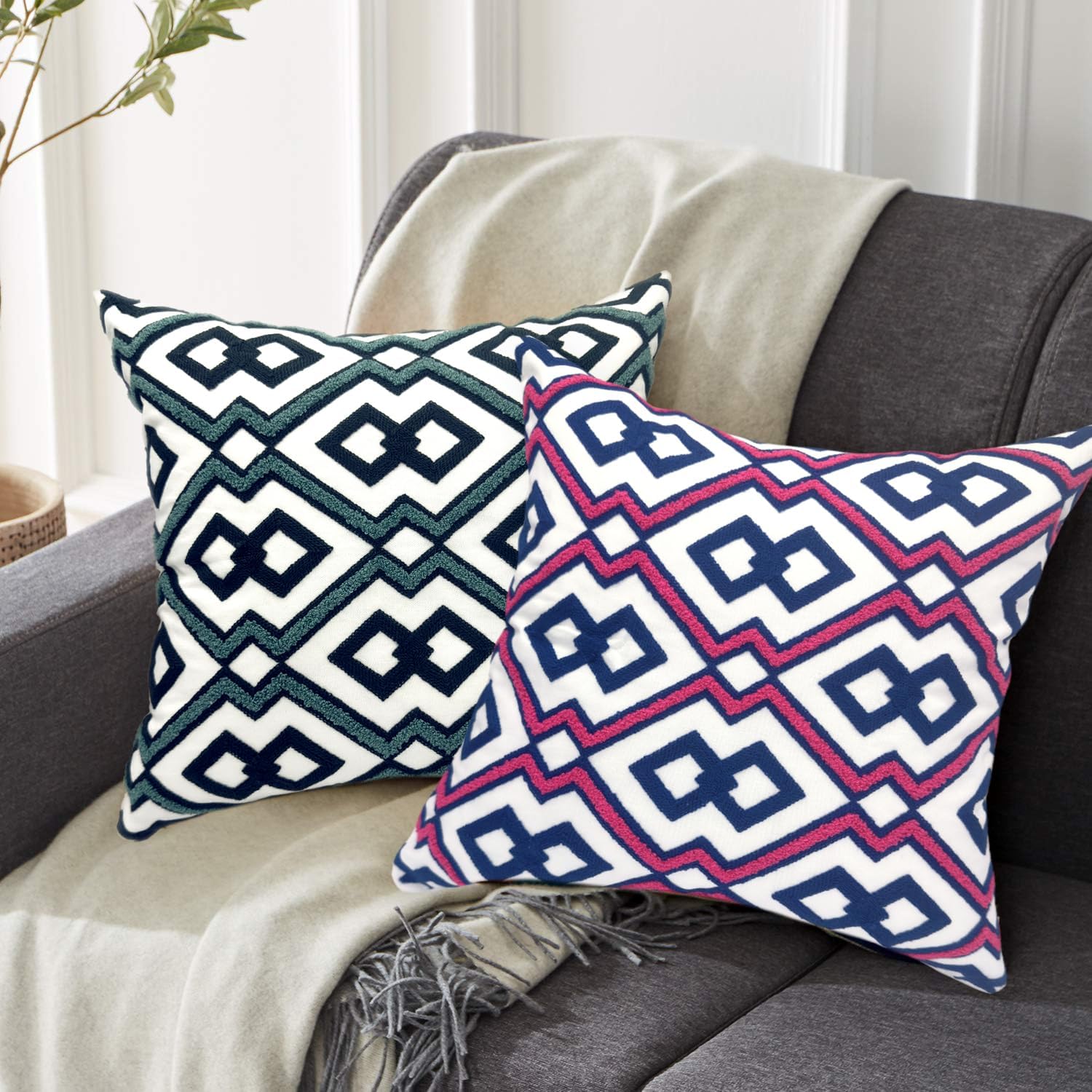 Alysheer Embroidered Decorative Throw Pillow Cover 18"x 18" Set of 2, Classic Boho Geometric Embroidery Pattern Cotton Rectangular Cushion Case for Sofa Couch Living Room Bedroom (Blue Pink)