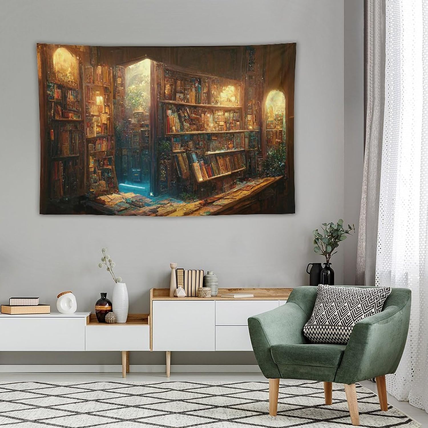 Kurtect Bookshelf Tapestry,Vintage Style Library Watercolor Art Theme Pattern Print Tapestries for Party Beach Picnic Blankets Tablecloths Living Room Wall Deocr, 60x90 in