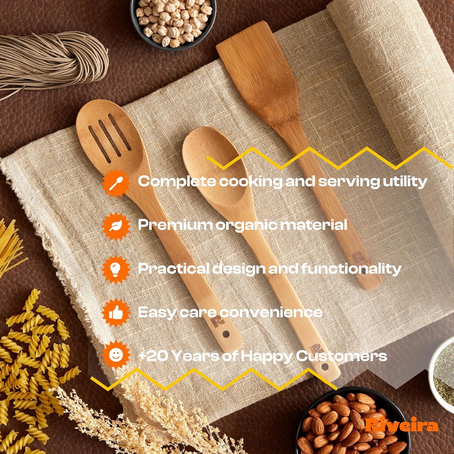 - PREMIUM ORGANIC MATERIAL - Unlike the cheap wooden spoons found on the market today, this deluxe assortment of wooden utensils set is crafted from 100% organic nonstick bamboo, which means they won’t scratch pots or pans, food debris is super easy to rub off, and stain-free properties ensure they won’t retain smells from cooking certain meals, so you can always prep, cook, and serve fresh using our wood spoons for cooking.