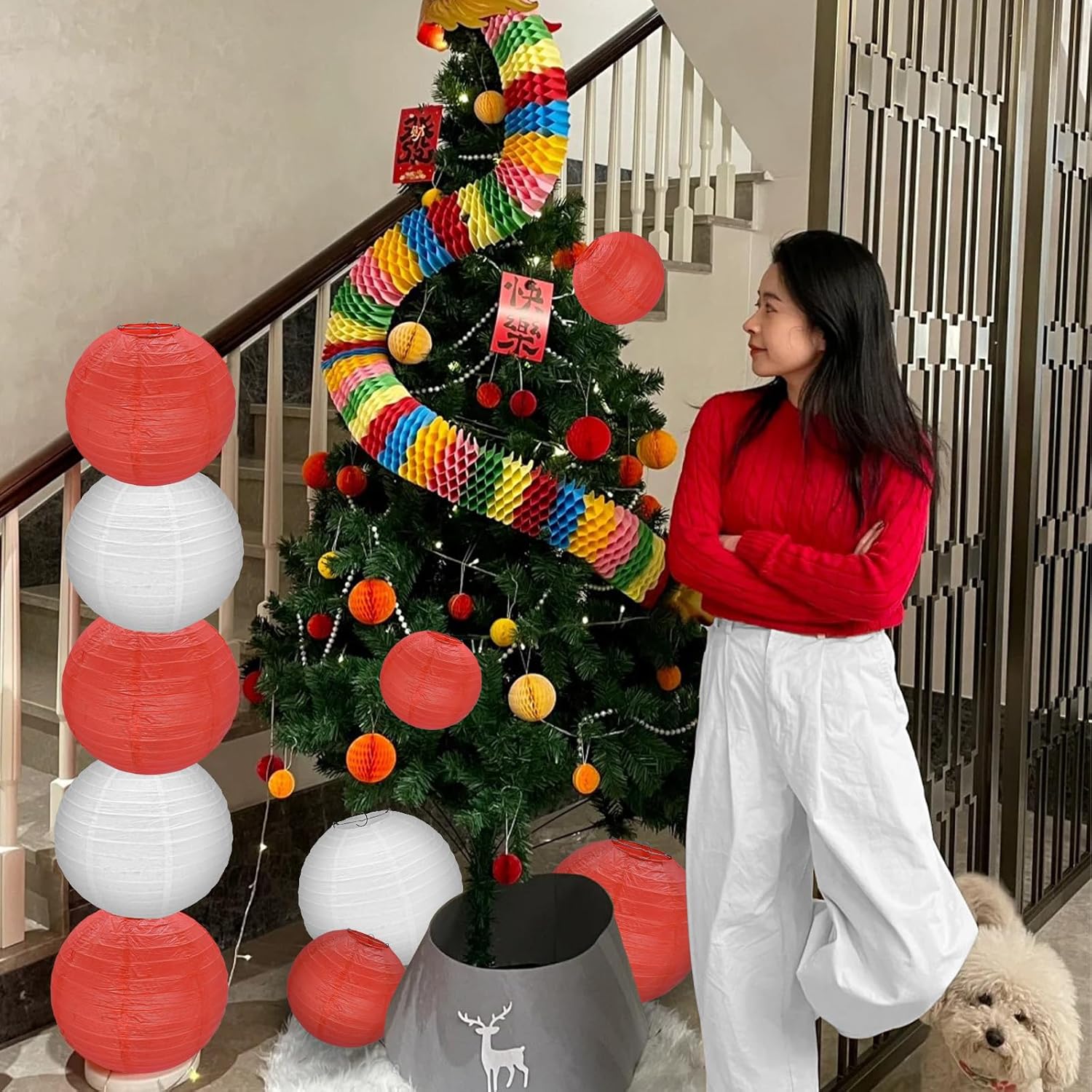 12Pcs Round Paper Lanterns Assorted Sizes (6" 8" 10" 12") for Home Decor, Restaurant, Church, Wedding, Birthday Party Decorations, Hanging Chinese Japanese Paper Lantern Lamps (White and Red)