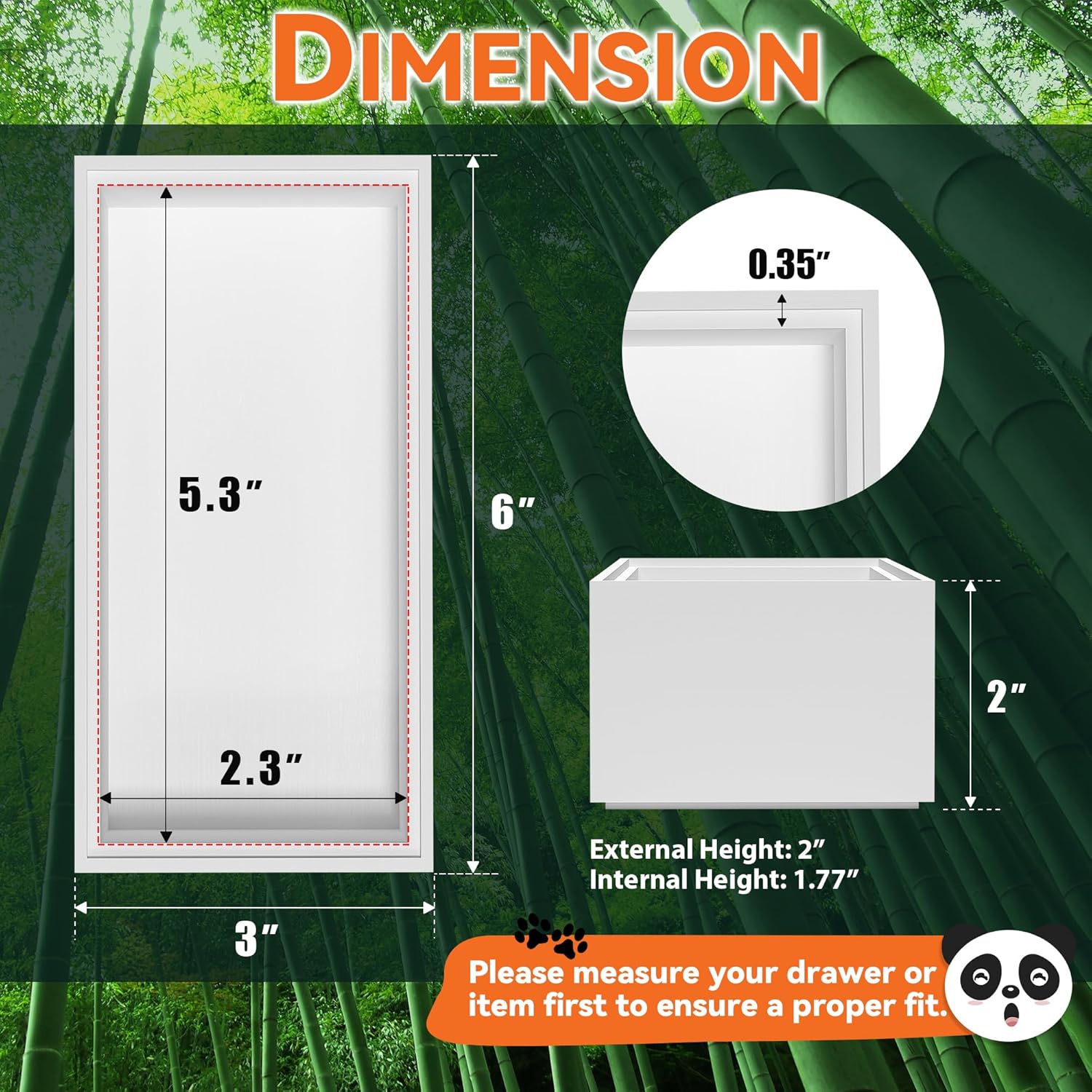 - Each bamboo drawer organizer measures: external size: 6" L x 3" W x 2" H; internal size: 5.3" L x 2.3" W x 1.77" H. Please check the size before purchasing
