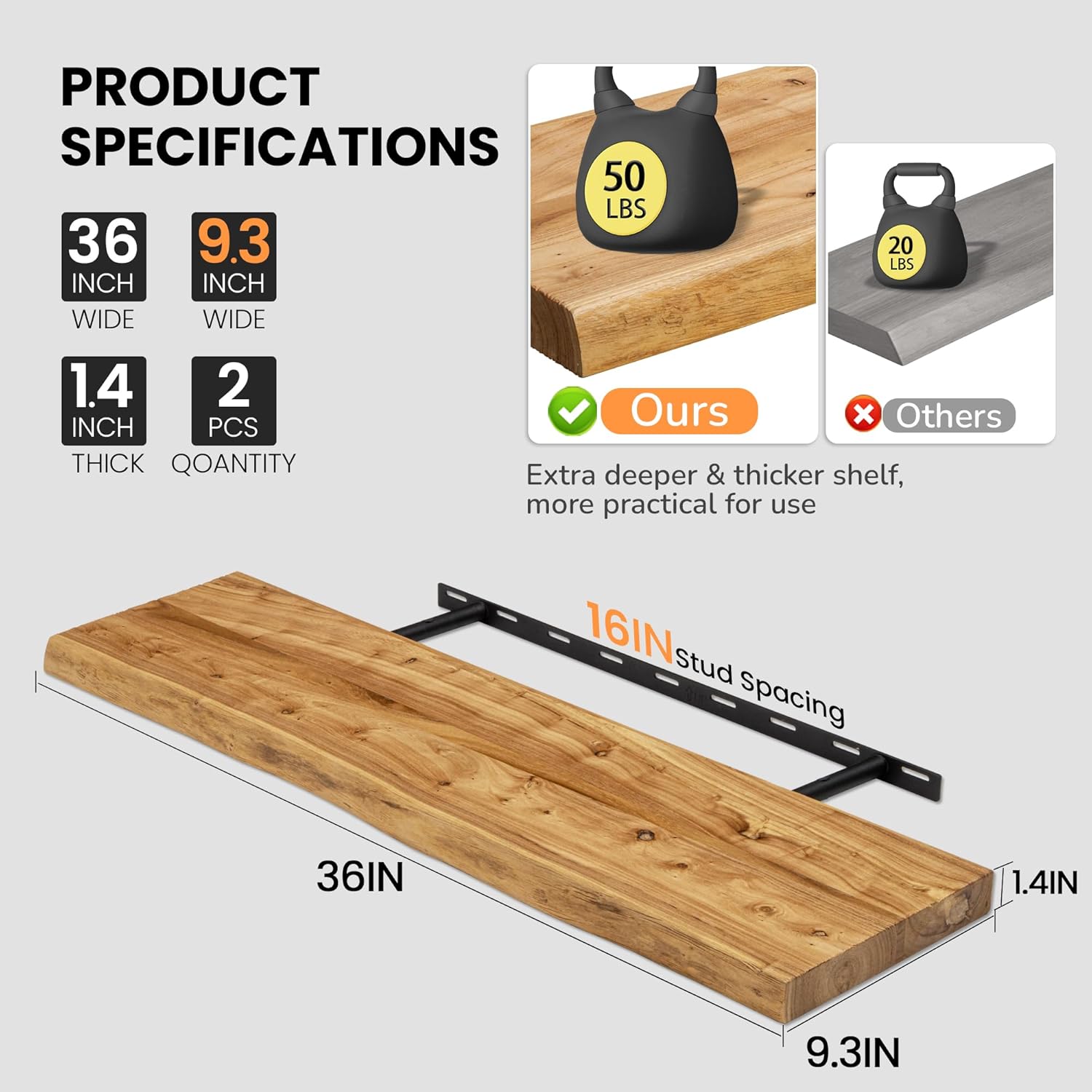 - 9.3" DEEP SOLID ELM WOOD: Fun Memories live-edge floating shelves are handcrafted from reclaimed elm wood and measure 36" x 9.3" x 1.4" each. Featuring natural grain, knots, and color variations, they add warmth and rustic charm to any space. Mount them vertically, side by side, or in corners for a clean, stylish look