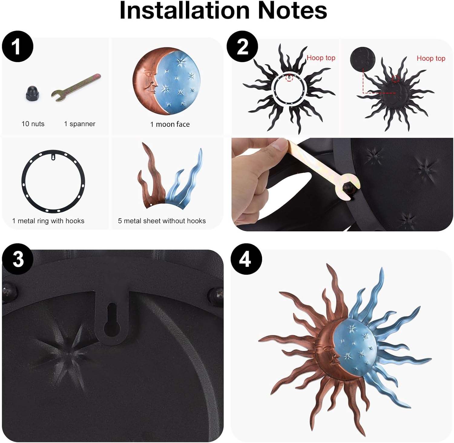 - Easy to Install:The large outdoor metal wall decor you receive is unassembled,and has been improved and upgraded.No extra tools are needed, just point the edge of the sun at the hole and tighten the screws.Each metal sun moon has a keyhole on the back,so you can easily hang it on the wall or fence.