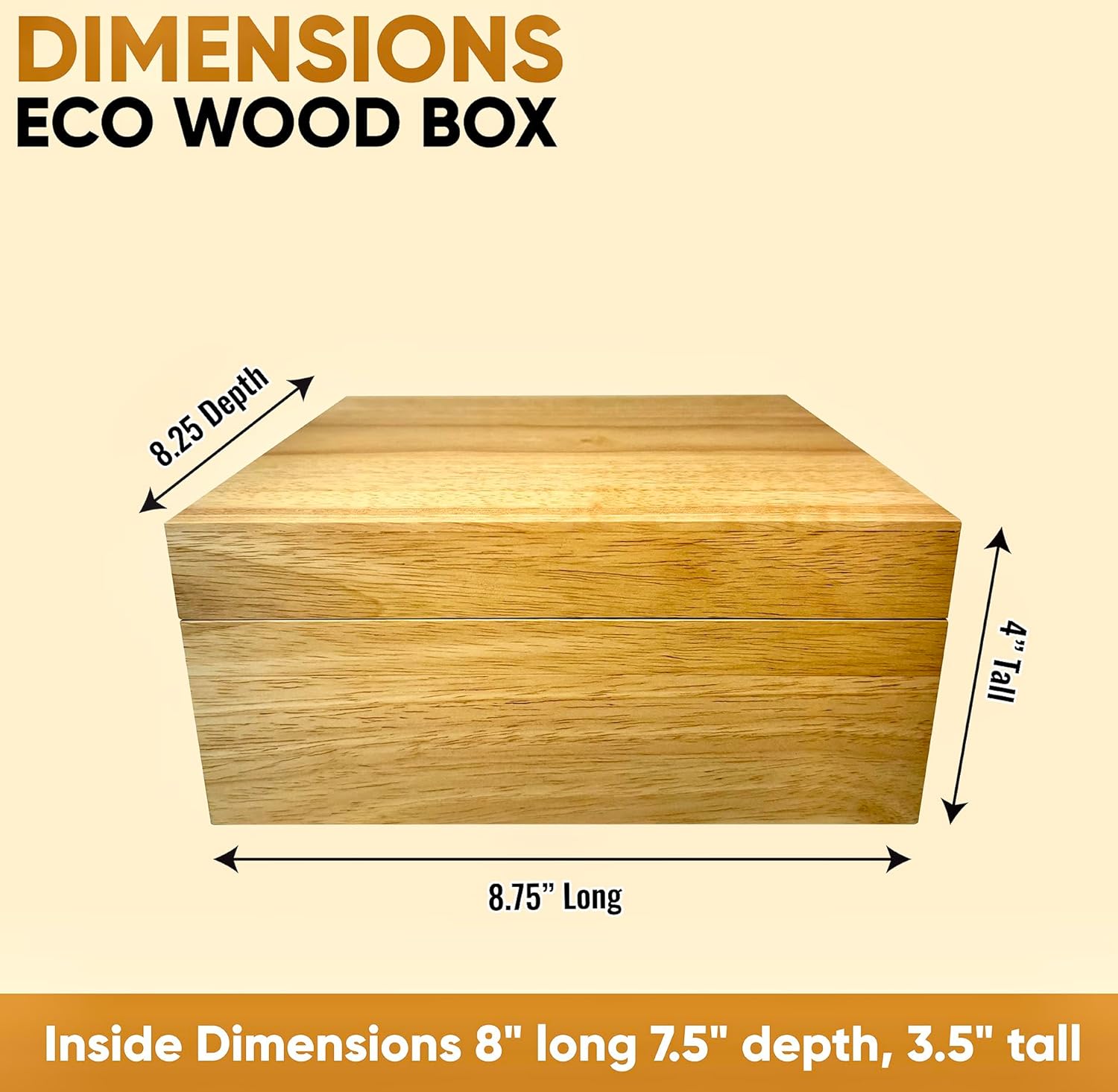 - Sized right for your space! Looks amazing on any table, desk, shelf or countertop!! Dimensions are 8.75β long, 8.25β wide, and 4β tall. Inside dimensions are 8β long, 7.5β wide, and 3.5β tall. Designed to clear up and make space on desks, countertops, drawers, bookshelves and more! Organize and declutter your home with a solid wood eco friendly box!