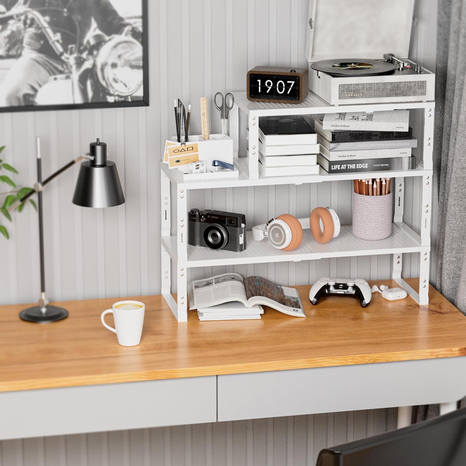 - âăExpandable,StackableăThe shelves can easily expand and contract according to your storage needs, whether it is kitchen clutter or office supplies.You can combine multiple shelves together to form a large storage system, or separate them into several separate smaller units(MeasureïŒ8.11"D x 16.54"W~27.17"W x 8.31"H/7.68"H/7.05"H/6.42"H)