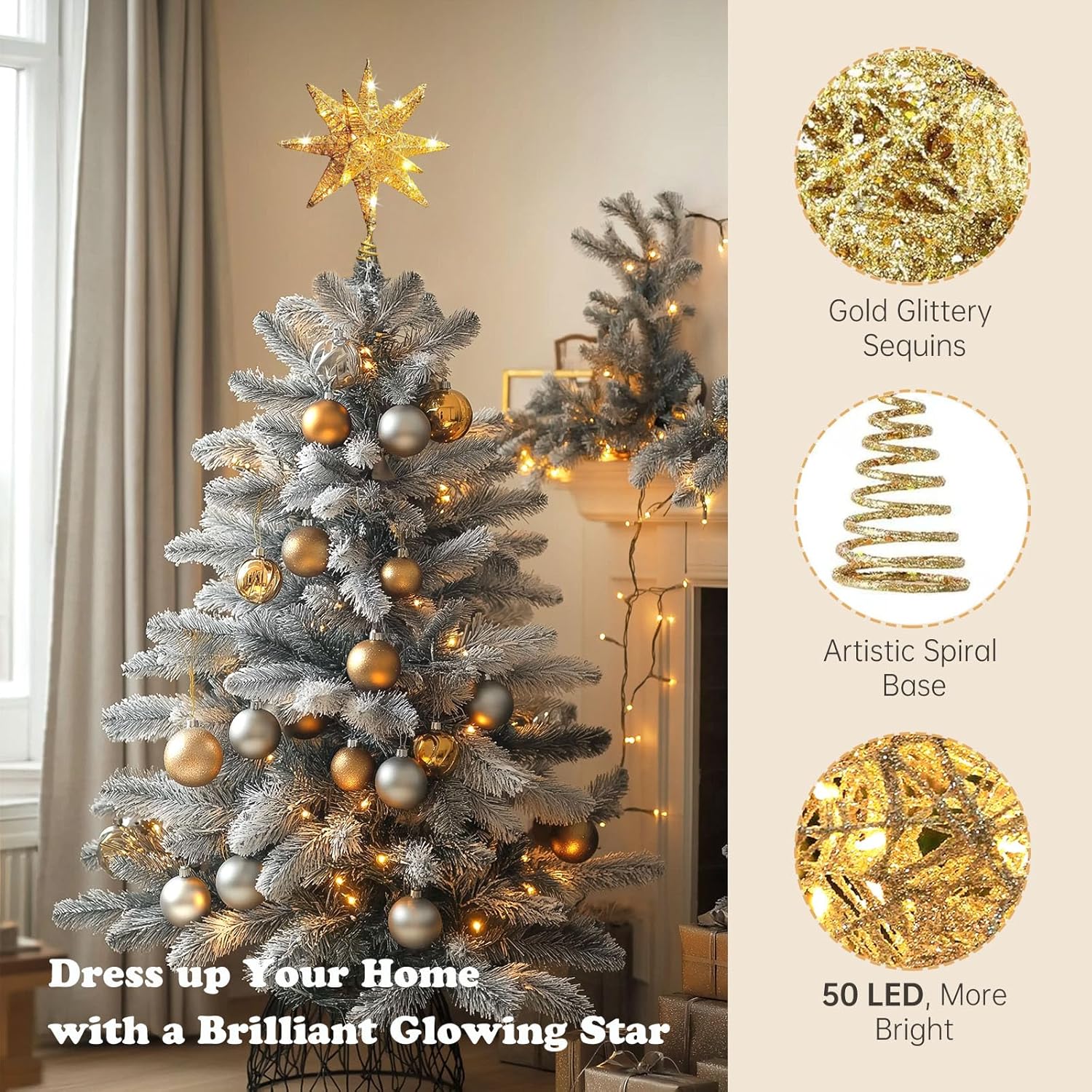 Christmas Tree Topper Star Gold with Warm White 50 LED Lights, Star Tree Topper for Christmas Tree Tradition Moravian Decor, 11X 7.87 Inch with 5m Long Line, Estrella para Arbol De Navidad