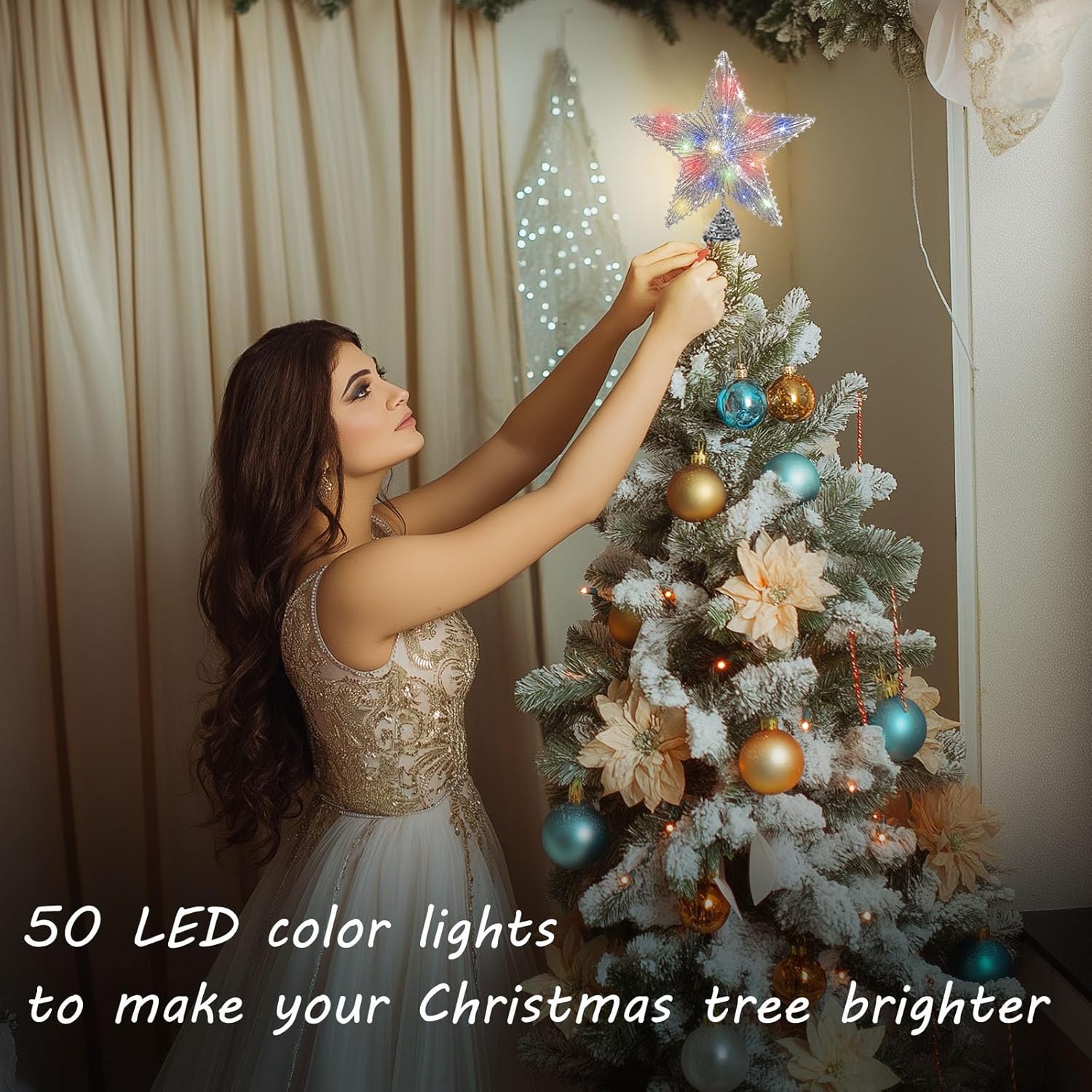 Silver Star Christmas Tree Topper with 50 Colouful LED Lights 8 Lighting Modes Timer, White Tree Topper for Christmas Tree Decorations and Xmas Holiday Seasonal Decor