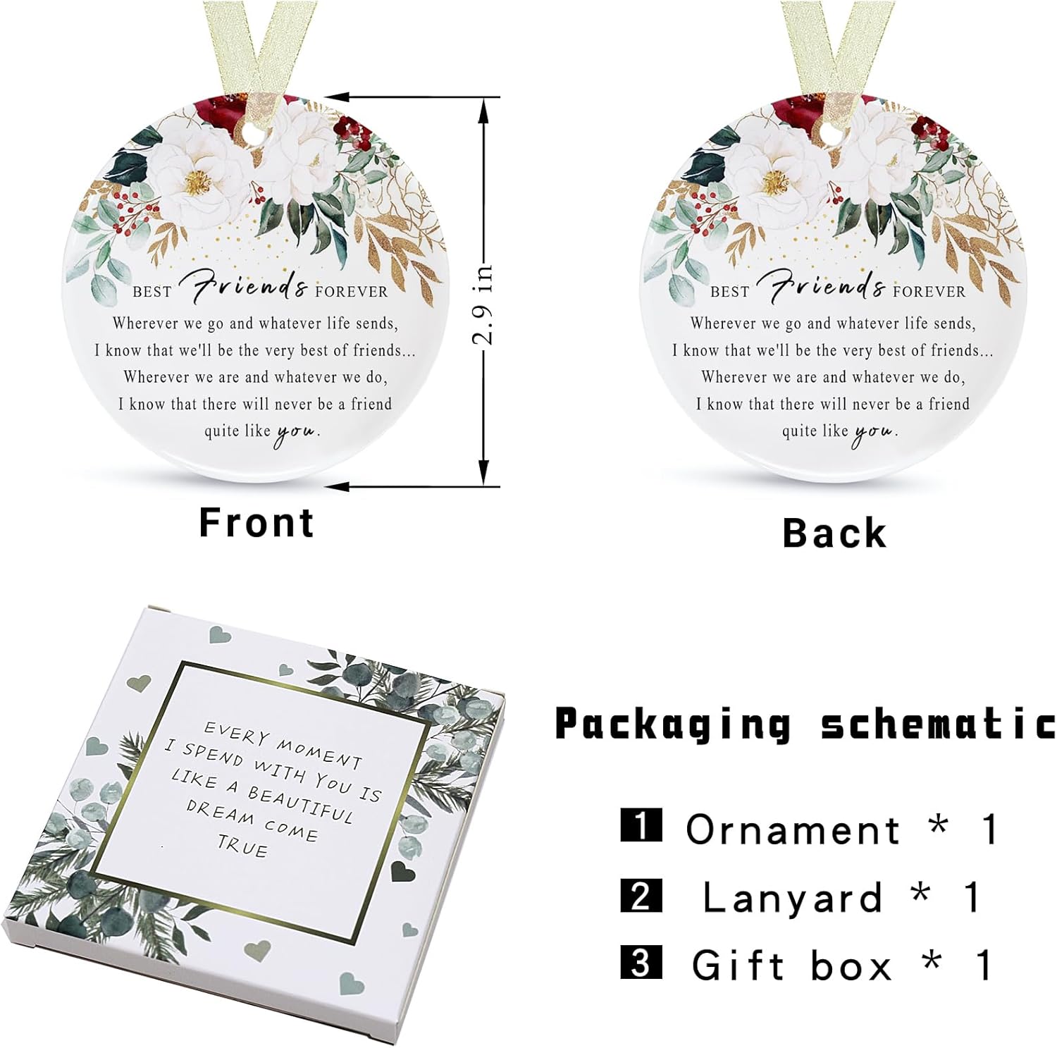 - 🌼【Perfect and delicate size】This is a friend memory ornament with a diameter of 2.9 inches and a thickness of only 0.18 inches. The product includes: a round friend ornamentt*1, a gift box*1 and a lanyard*1. The gift box comes with it makes it easy for you to give the best friend ever gifts directly to family and friends and other special people in your life, and the lanyard that comes with it helps to hang it easily on the Christmas tree or anywhere you want.