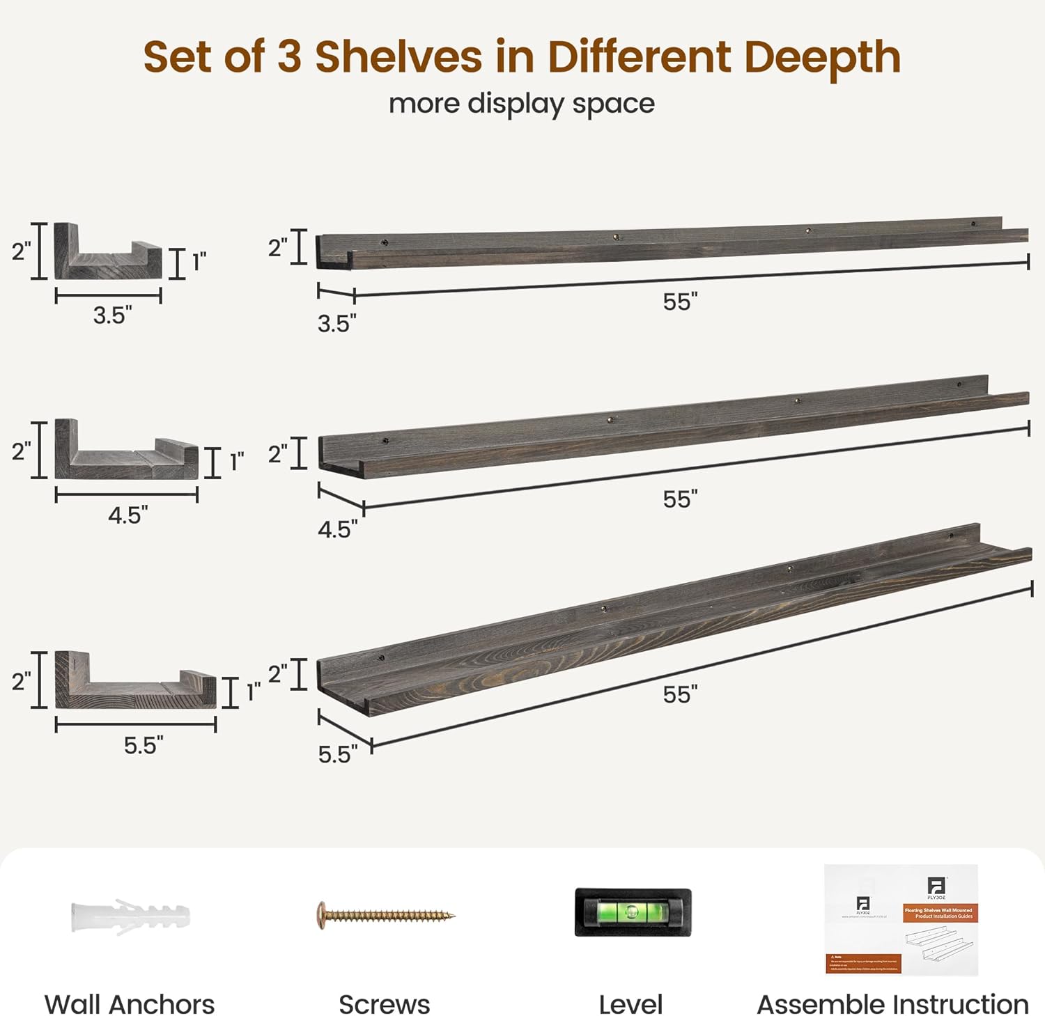 - Large Storage Space Nursery Shelves: Mount these floating ledge shelves on your nursery wall, kids can stow books, toys, stuffed animals and games in wall shelving, This nursery wall shelf Size is 55'' Width, 2'' Height, and 3 packs in different depth(3.5'', 4.5'', 5.5'')