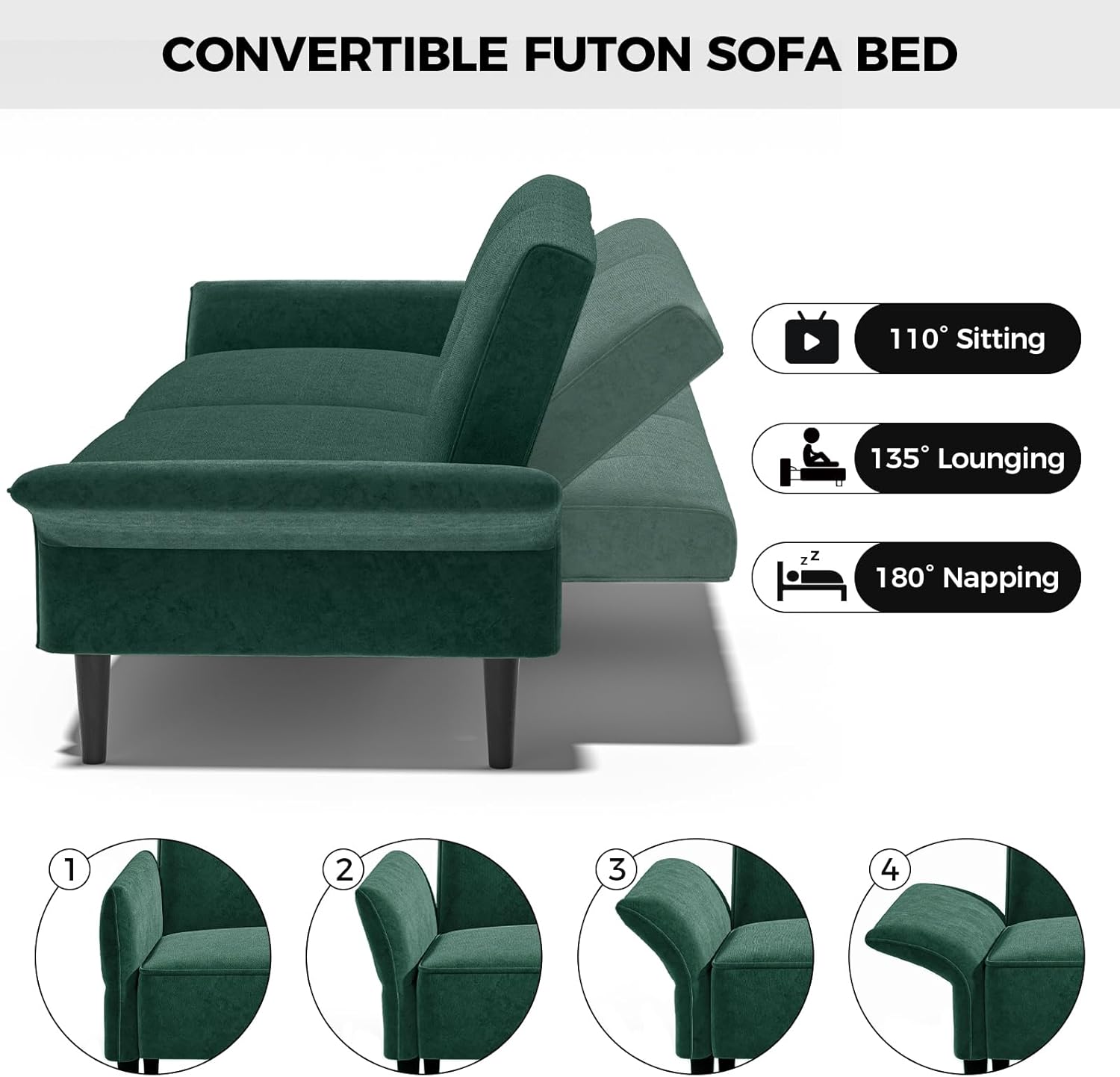 - 【Four-position Adjustable Armrests】 This convertible sofa bed is truly a perfect blend of style and durability. The armrests on both sides can be deployed to outward for maximum side lying area, and the maximum deployment angle can be up to 90°. Meanwhile, with the two soft report pillows provided, you can place the pillows at the cervical vertebrae and lumbar region to effectively relieve fatigue