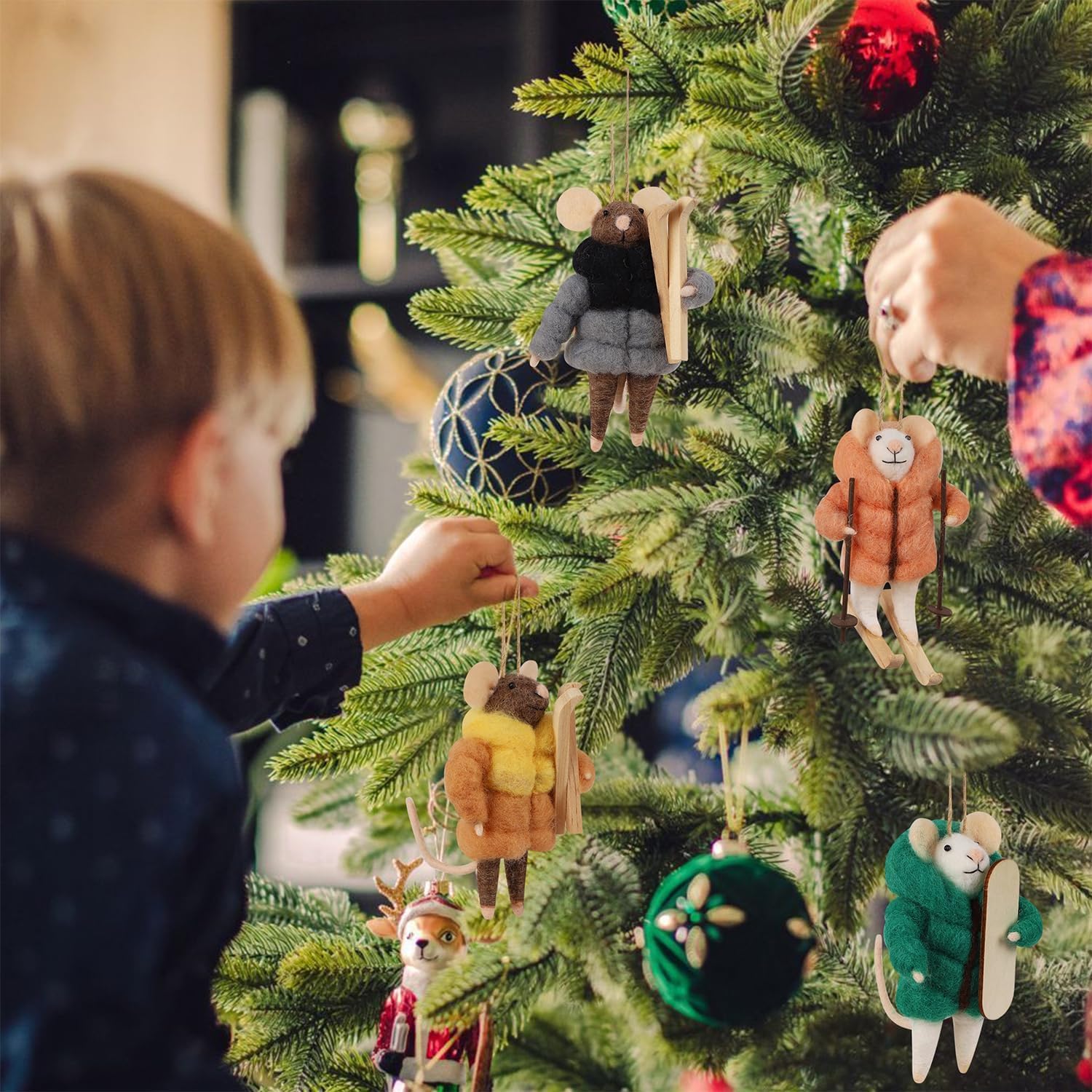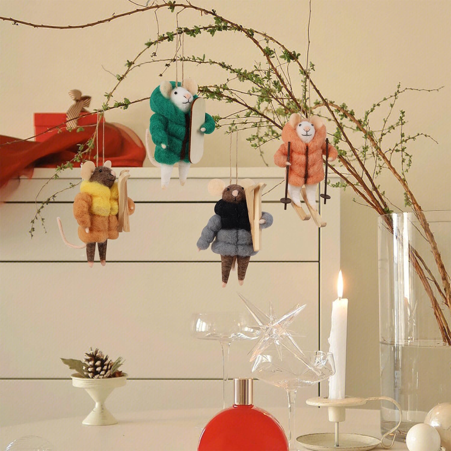 - CHRISTMAS FELT SKIING MOUSE: This set includes four charming felt Skiing Mice ornaments, each showcasing different color expressions, perfectly capturing the whimsical spirit of the holidays and adding a touch of cuteness to your Xmas decor. The size approx. 3" X 3.5" X 4.7". Notes- It is for decoration, not a toy for children