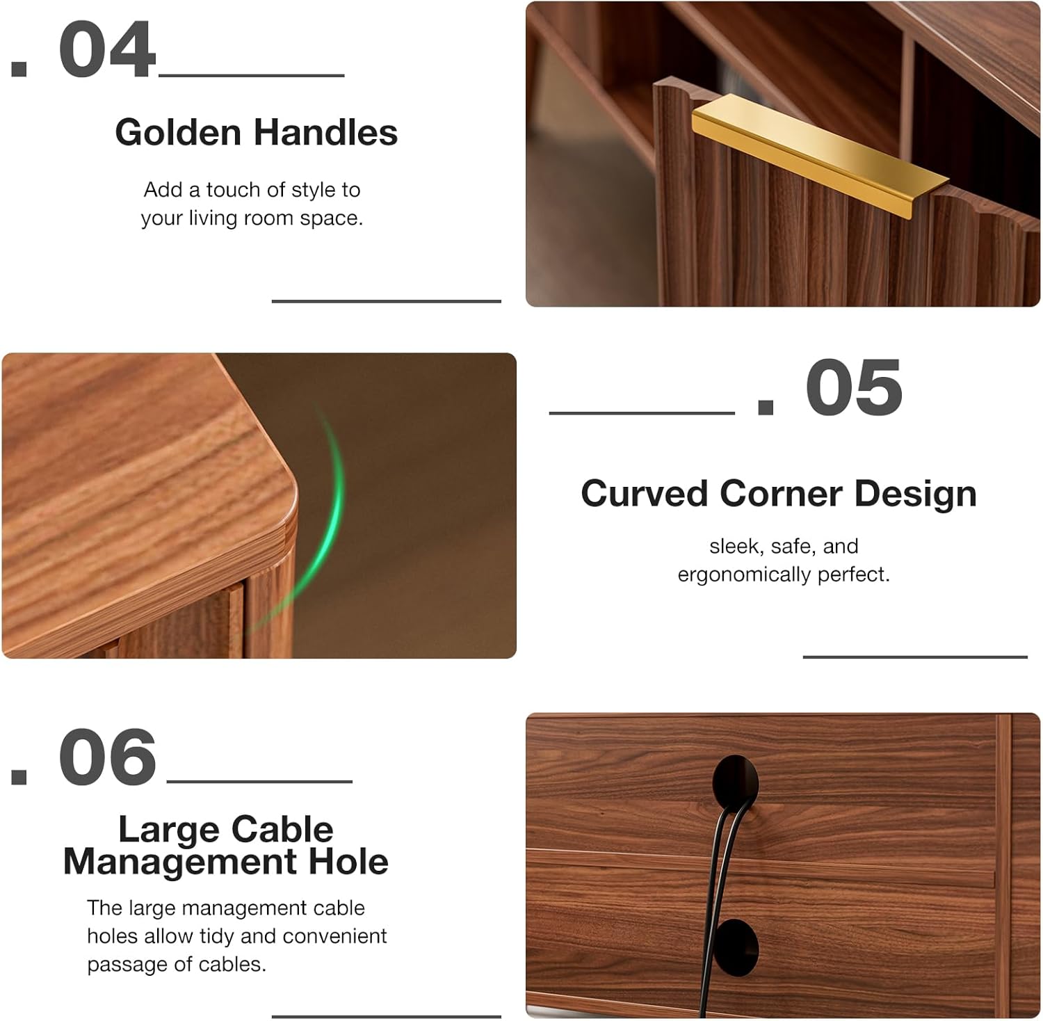 - Organized Storage: Features a middle shelf & 2 spacious cabinets for all your favorites. Plus, 2 rear cord holes keep wires neatly tucked away. Showcase or conceal β this mid-century entertainment center does it all with style.