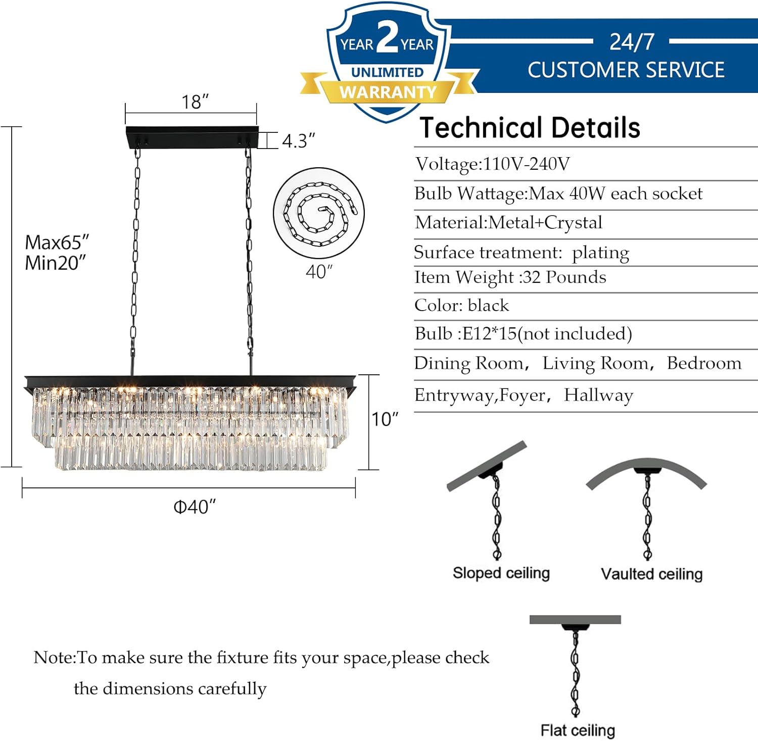 - BLACK CRYSTAL CHANDELIERS:This chandeliers for dining room using K9 crystal with 2-tier design and black rectangular lamp frame.When you turn on the light,the lighting will reflect through the crystal,adding a romantic and unique atmosphere to your room