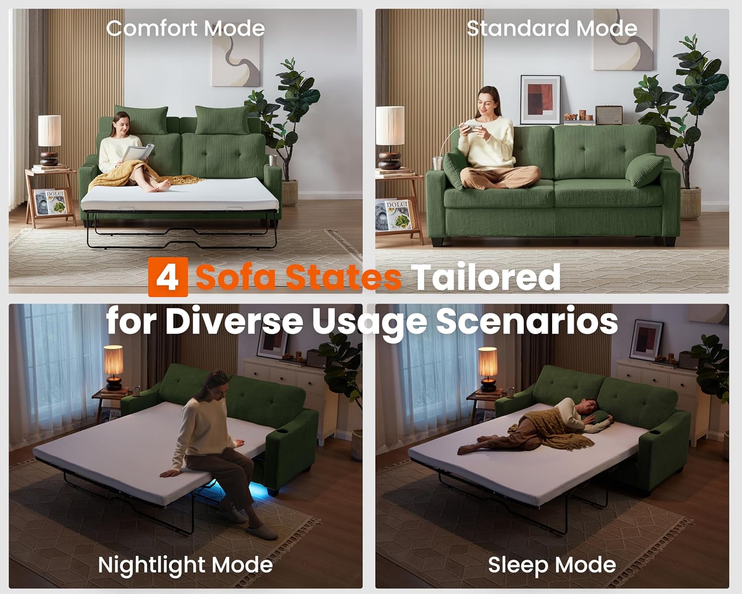 - ăFour Sofa States for Various ScenariosăOur sofa bed supports four different configurations to meet your varying needs. It operates in a standard mode for daily use; by adjusting it as shown in our diagram, you enter the comfort mode, perfect for enjoying leisure time in bed; switch to the nightlight mode for easy nighttime standing; and the sleep mode optimally supports your sleeping needs
