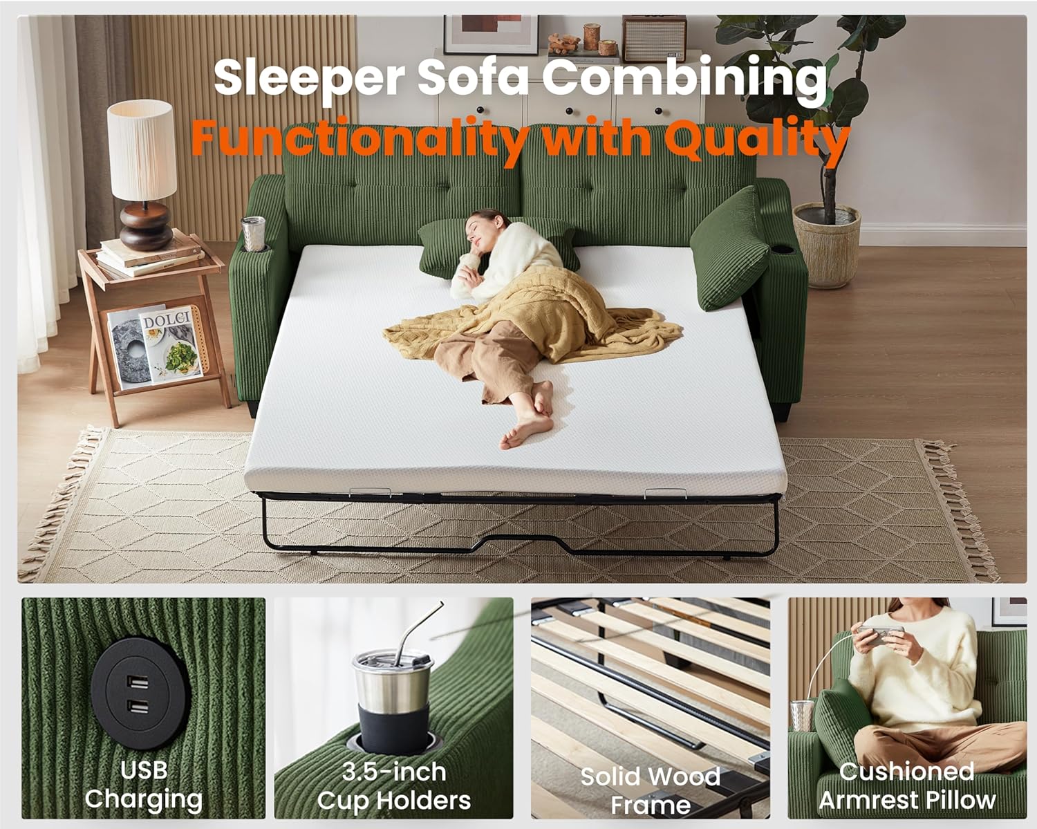 Pull Out Sofa Bed, Full Size Sleeper Sofa, 2-in-1 Convertible Corduroy Couch with USB Charging, Memory Form Couch for Living Room, Apartment and Small Space (Green, Corduroy - Queen Size)