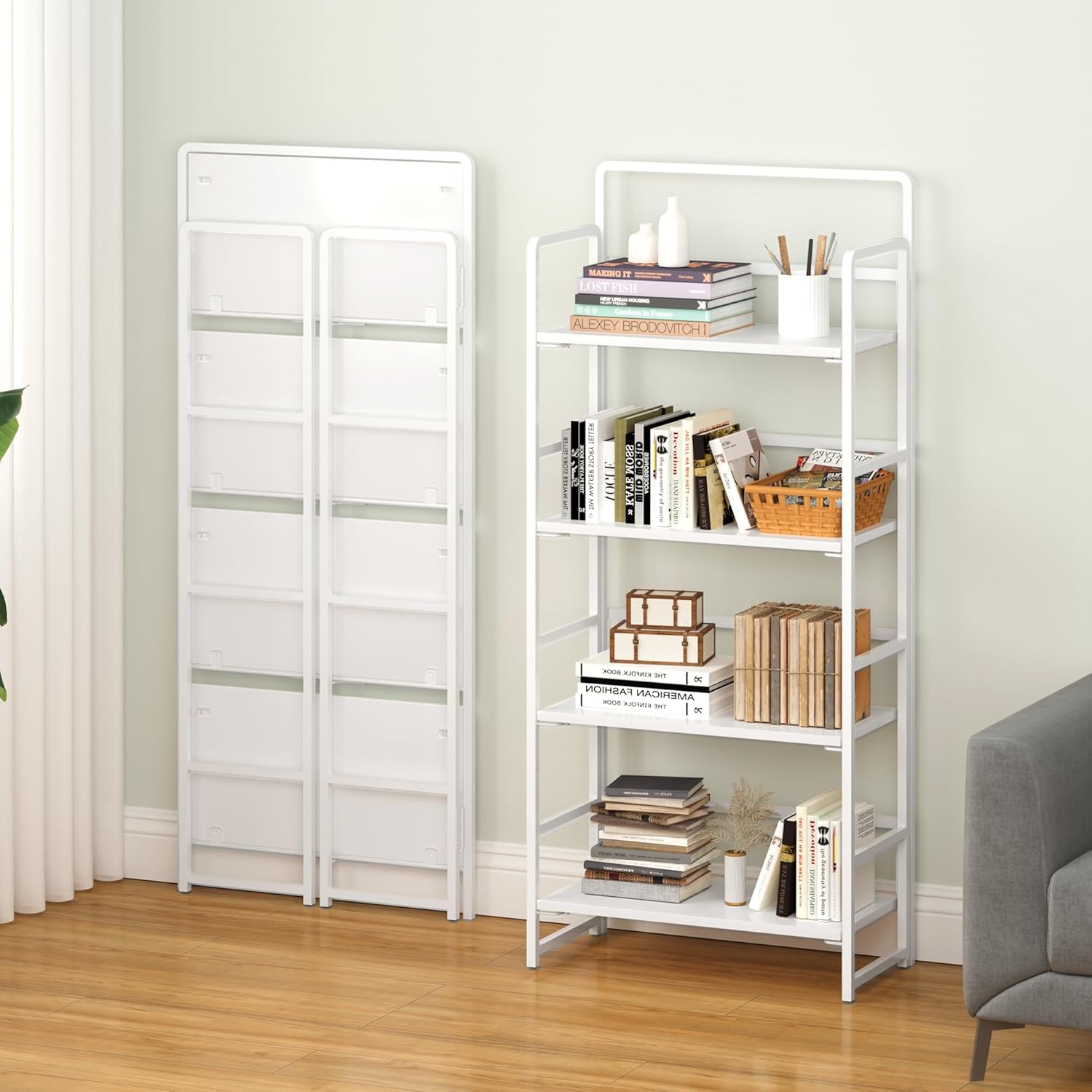 4NM No Assembly Foldable Bookshelf, 4-Shelf Collapsible Bookcase Storage for Small Spaces, 54" H, All White