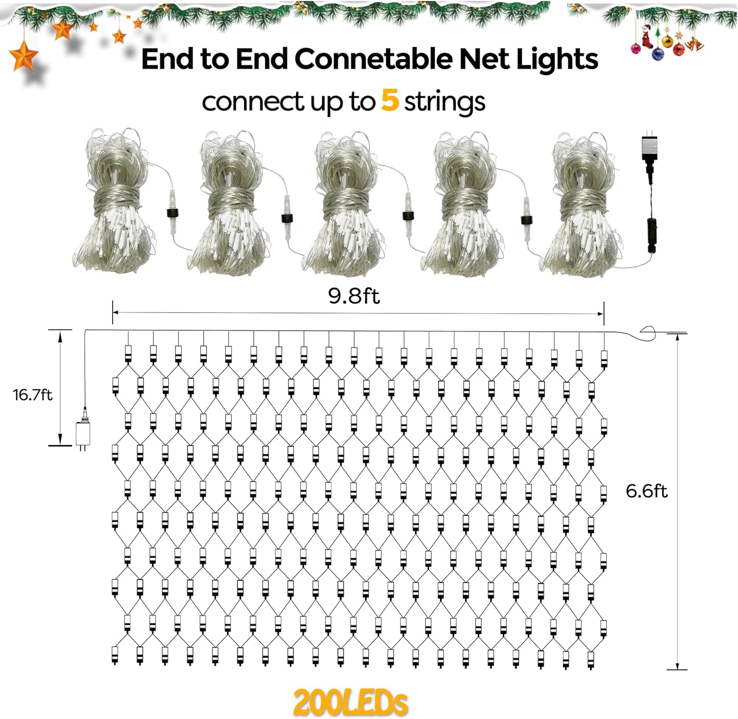 - End to End Connectable Design: Each set of our Xmas net lights come with male and female connector, allowing them to be connected in series with each other. It supports up to 5 strands be connected, totally 1000 LEDs, achieving the ability to control multiple net lights with only one electrical socket. Attention: If connected more than 5 strands, it will cause the brightness to gradually decrease.