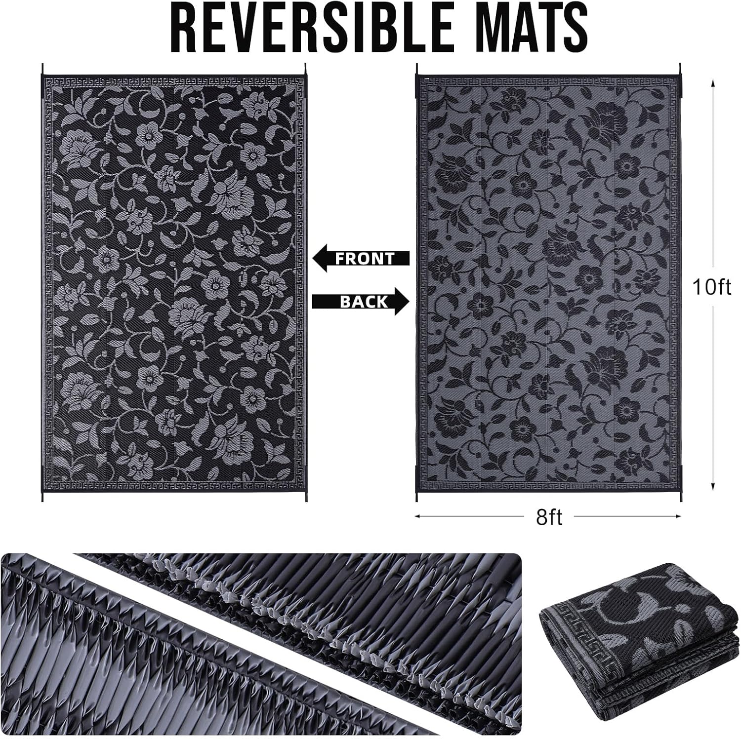 OLANLY Waterproof Outdoor Rug 8x10 ft, Outdoor Plastic Straw Rug with Flower Pattern, Reversible RV Mat for Patio, Camping, Balcony, Deck, Backyard, Black & Grey