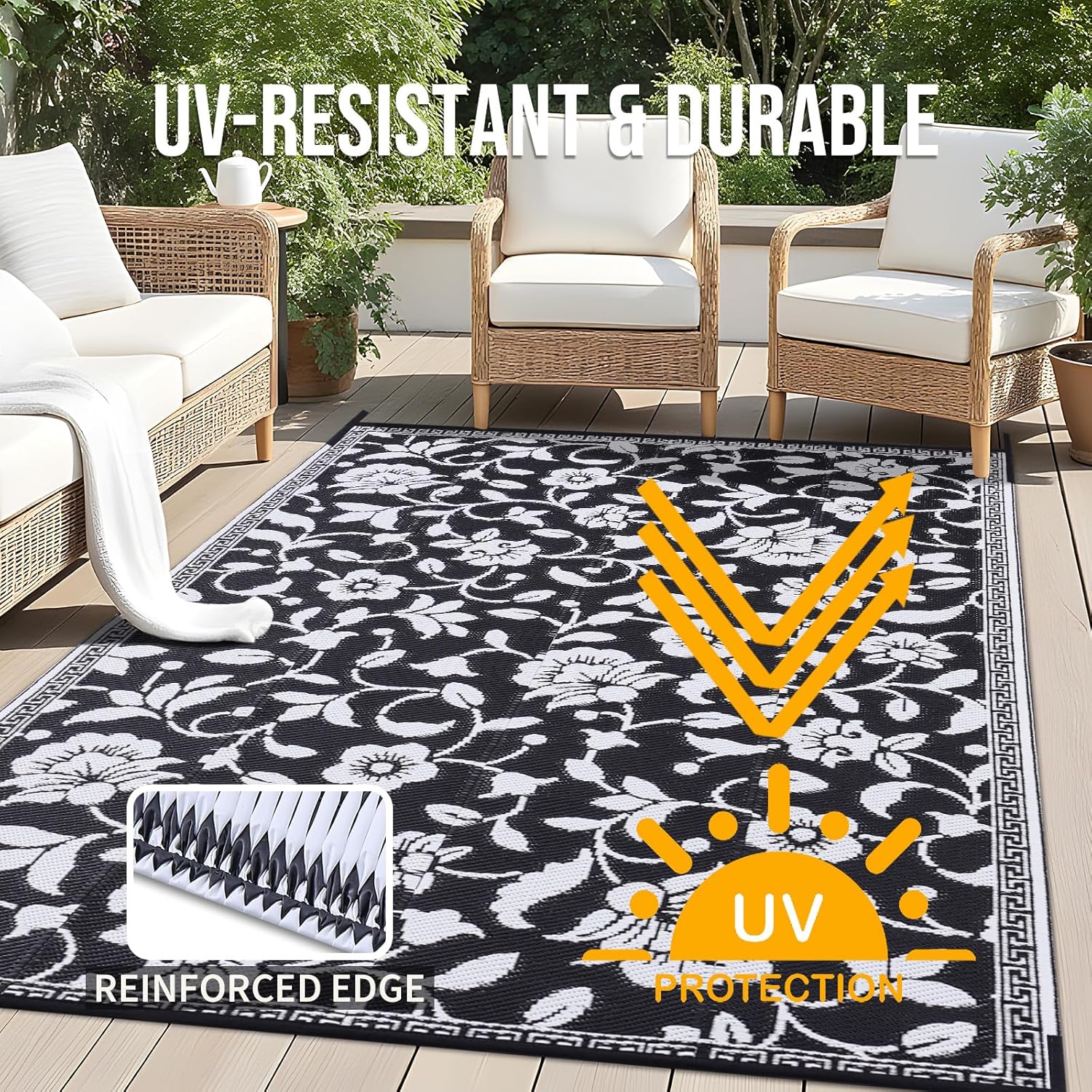OLANLY Waterproof Outdoor Rug 6x9 ft, Outdoor Plastic Straw Rug with Flower Pattern, Reversible RV Mat for Patio, Camping, Balcony, Deck, Backyard, Black & White