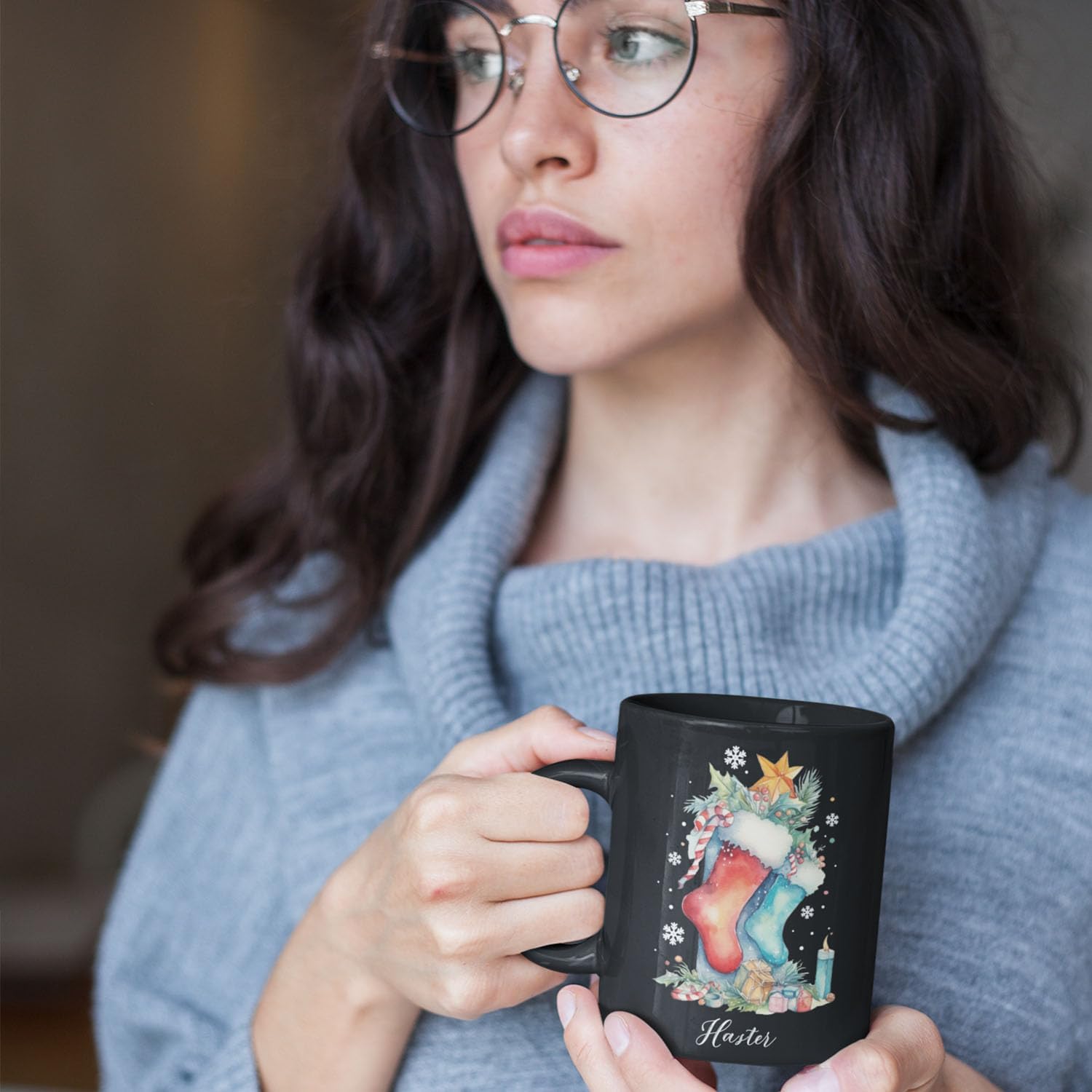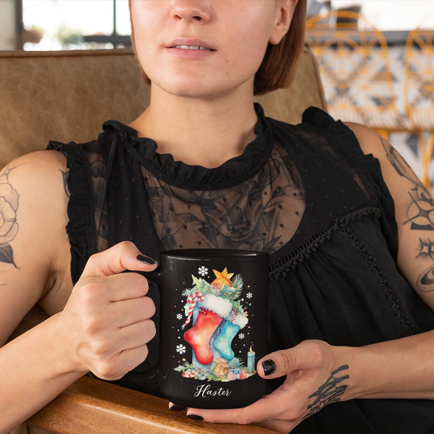 Custom Funny Christmas Cup, Christmas Sock With Gifts And Candle Design Mug, Customized Name Christmas Black Cup 11oz 15oz, Personalized Coffee Mug For Christmas, Christmas Sock Detailed Cup