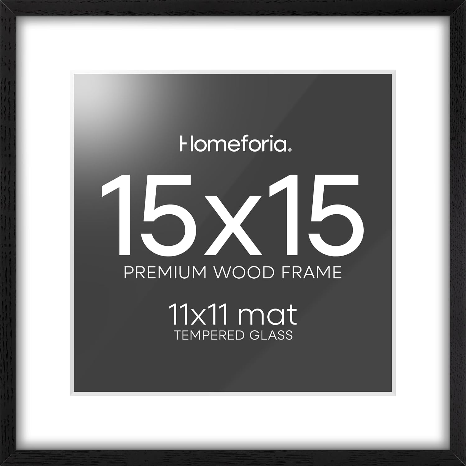 Homeforia 15x15 Black Wood Frame, High End Oak 15 x 15 Square Picture Frames with Mat 11 by 11 inches Photo, 15by15 Black Wooden Poster Frames Matted to 11x11 Print, Tempered Glass, Wall Kit, Set of 1