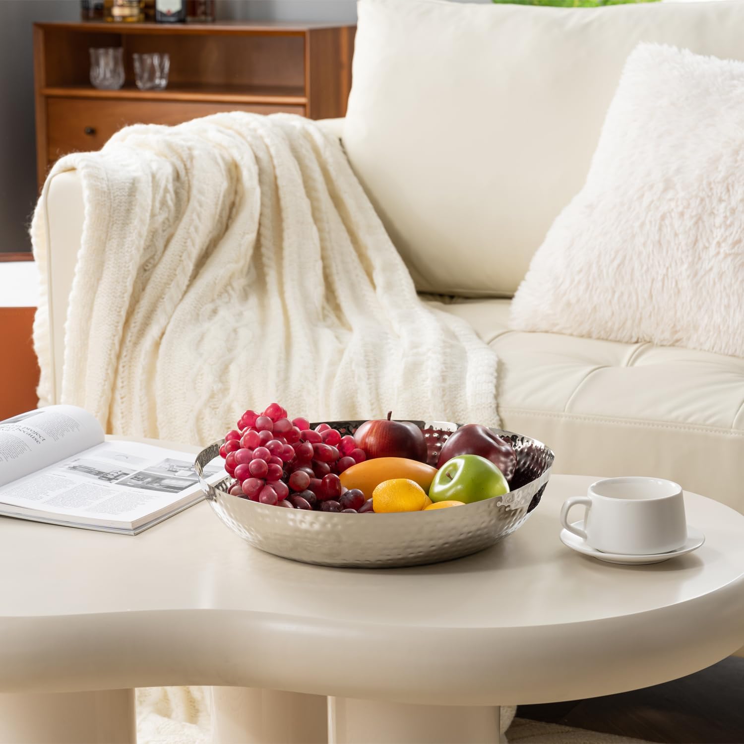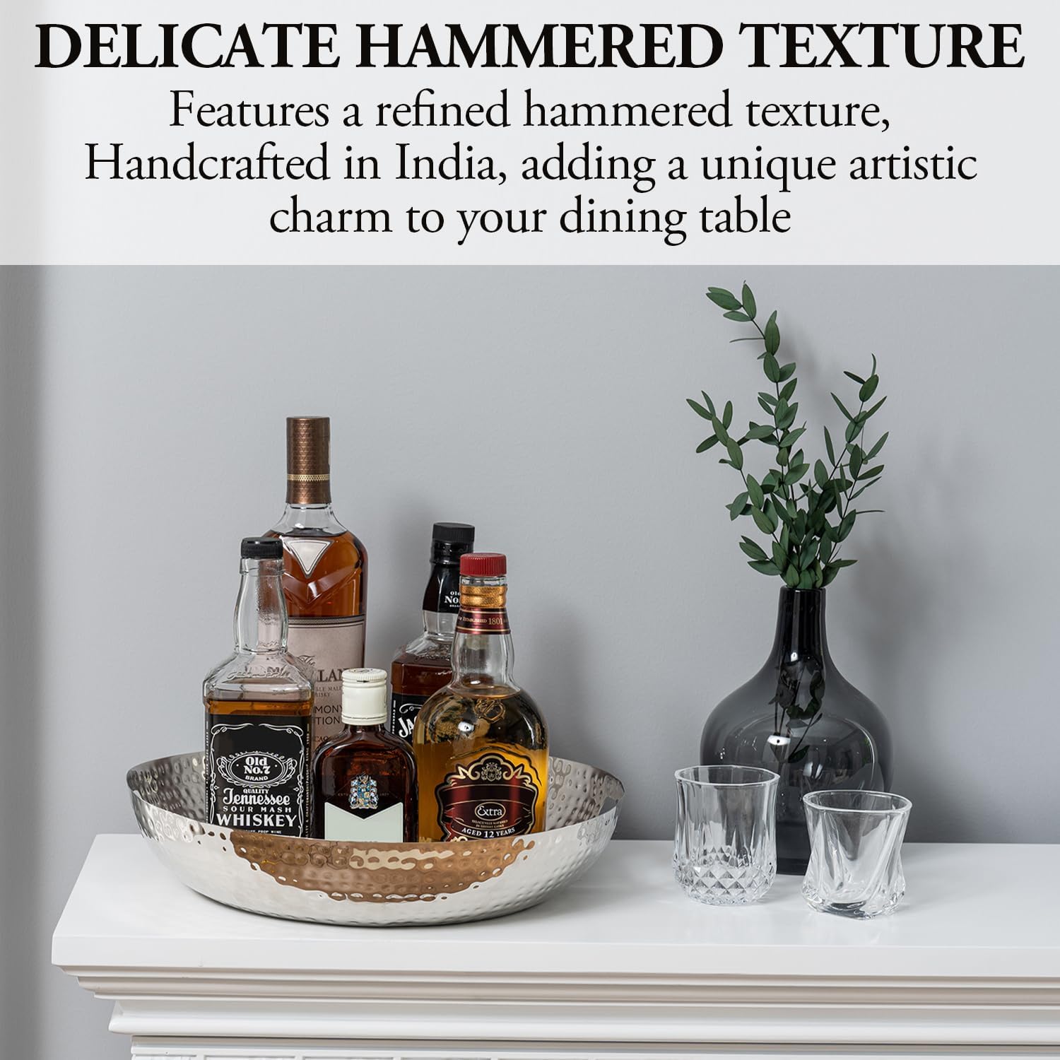 MyGift 14 Inch Deluxe Decorative Dish Tray Centerpiece Base, Silver Tone Plated Hammered Aluminum Fruit Bowl Serving Platter with Cutout Handles - Handcrafted in India