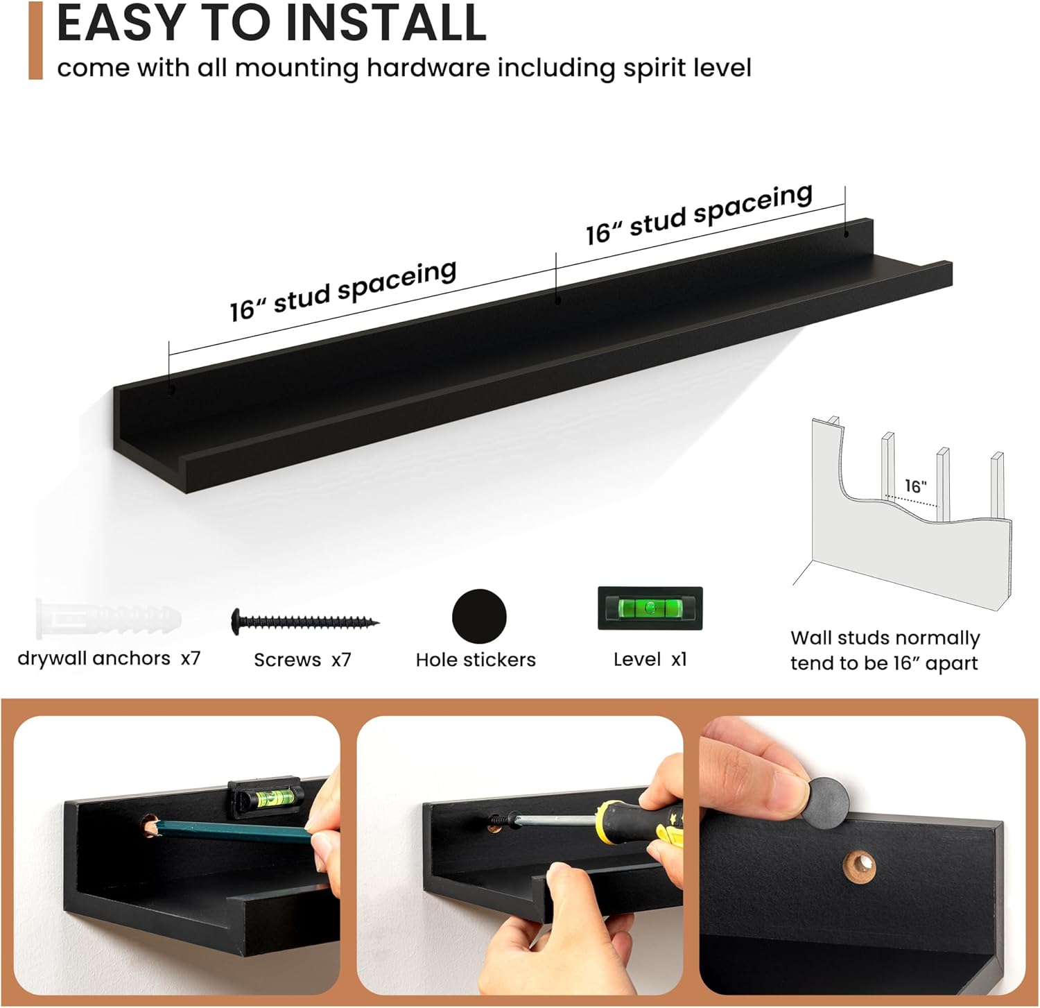 Fun Memories Picture Ledge Shelves Set of 2, 36 Inch Rustic Wall Mounted Floating Shelves with Lip for Home Storage and Décor in Bathroom, Kitchen, Nursery, Bedroom, Living Room, Black