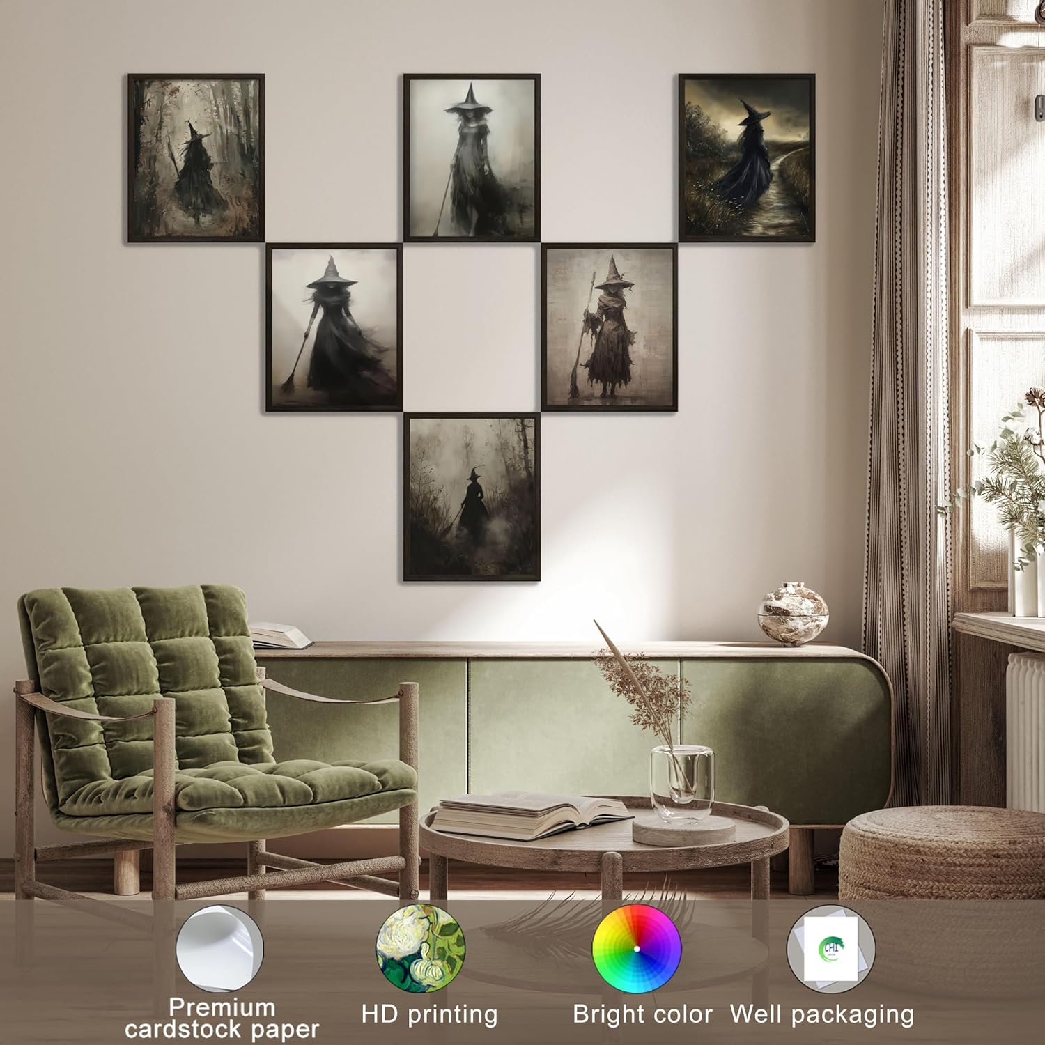 LANCHI95 6 Pcs 8x10in Vintage Rustic Witch Posters Halloween Wall Art Witch in The Forest Painting Prints Goth Dark Moody Wall Decor for Living Room Bedroom 8x10 in (UNFRAMED)